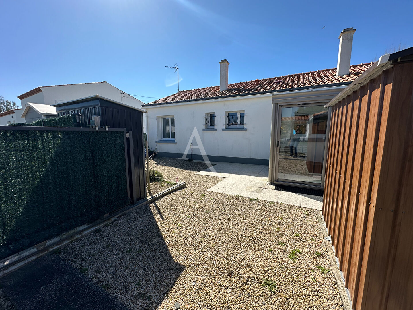 Extérieur facile d'entretien avec terrasse et espace gravillonné.