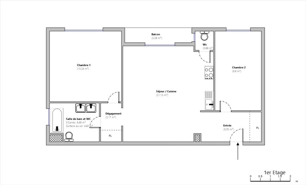 L'appartement se compose d' une entrée avec placards intégrés, un séjour lumineux avec cuisine ouverte équipée, deux chambres, une salle de bains avec un WC, un WC indépendant, un balcon et une cave pour du stockage supplémentaire.