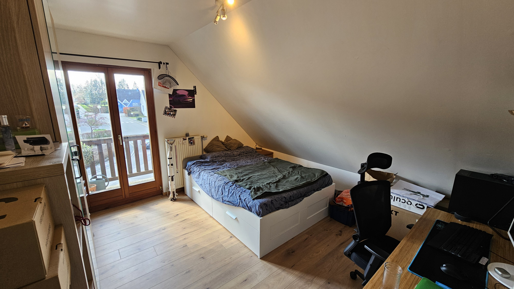 A l'étage, trois chambres (14.7m2 - 12.4m2 - 14.5m2), une salle d'eau avec WC.