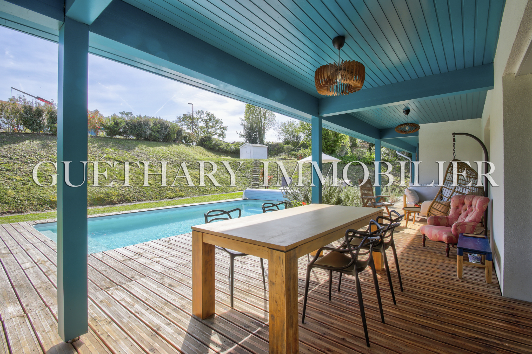 A moins d'1 km des Docks de Biarritz et à 5 km des plages, grande maison de plain pied moderne en parfait état avec piscine chauffée. Construite en 2018, ossature bois, elle offre 3 belles chambres donnant sur jardin-piscine et un immense salon ouvert sur cuisine moderne entièrement équipée. Belle terrasse couverte où il fait bon vivre, table repas, salon de jardin, plancha etc...Orientation plein Sud, pas de travaux à prévoir. Belle parcelle de plus de 1200 m2.