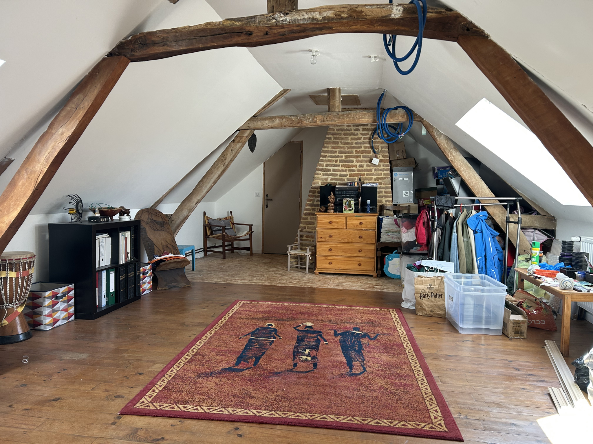 A l'étage : pièce palière de 36m2 et chambre. Possibilité de diviser le palier pour créer une 3ème chambre.
