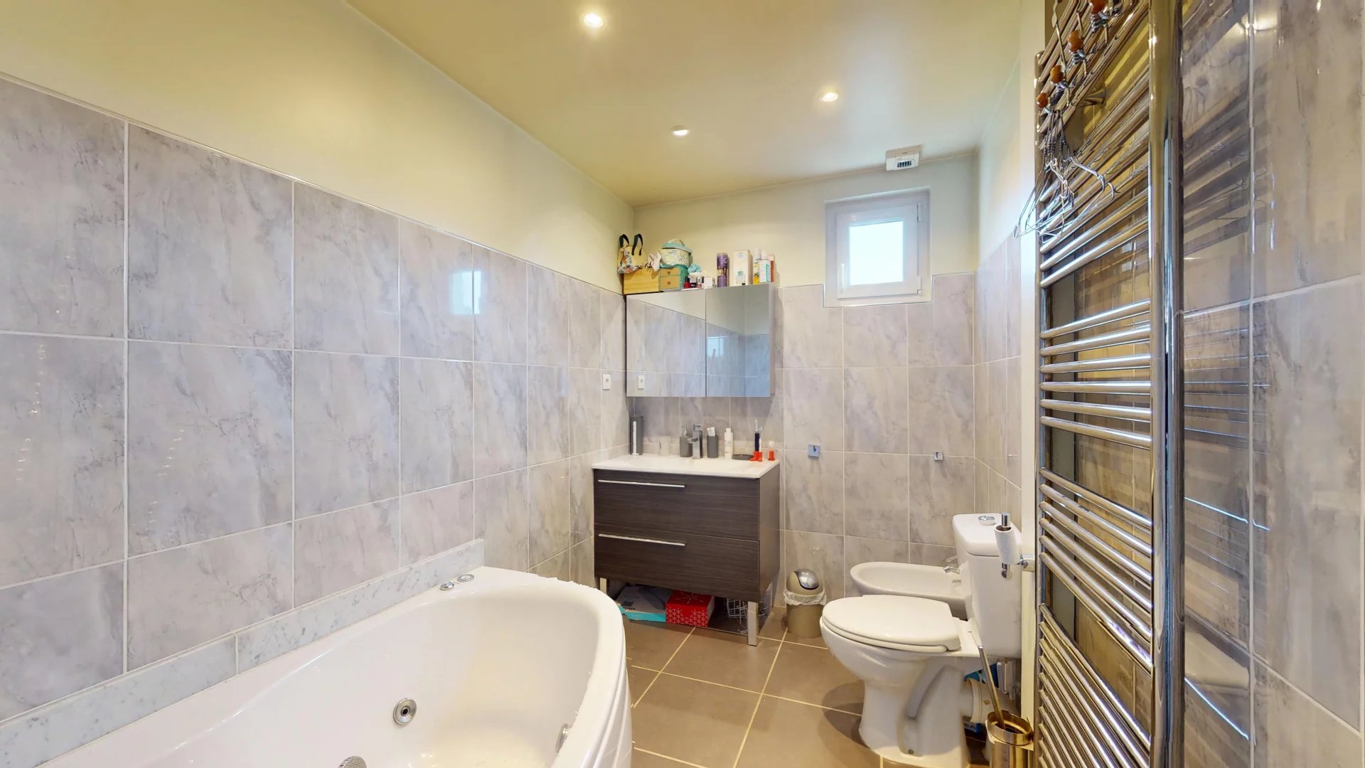 Une troisième chambre avec sa salle d’eau privative, ainsi qu’un espace bureau/dressing, idéal pour télétravail ou rangement.