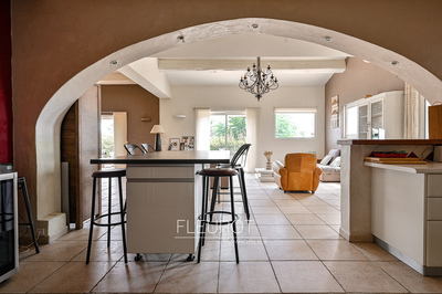 Entrée sur séjour avec plafond cathédrale, salon coin cheminée, espace salle à manger, une cuisine ouverte aménagée et équipée, un cellier, toilette invité, 2 grandes chambres en RDC, placard et dressing, une salle de bains avec douche, une 3ème chambre, grande terrasse extérieure et 2 terrasses couvertes, cuisine d'été, à l'étage une mezzanine, un espace dressing, une chambre avec tropézienne, une salle d'eau et wc.