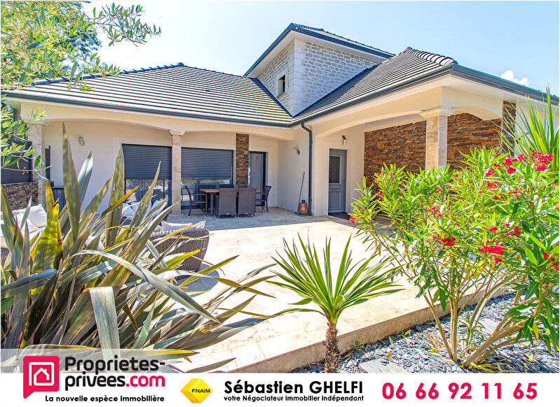 comprenant: entrée, grand salon séjour ouvrant sur cuisine aménagée et équipée (four-micro-onde-plaque-hotte-lave-vaisselle-réfrigérateur- cave à vins), 3 chambres dont 1 parentale avec dressing et salle d'eau, salle avec douche et double vasque, wc , 2 garages et 3 terrasses dont 2 couvertes, belle piscine sur parcelle de 2860 m².