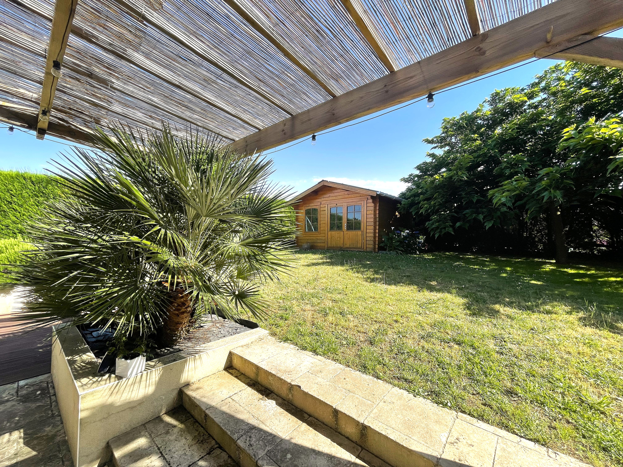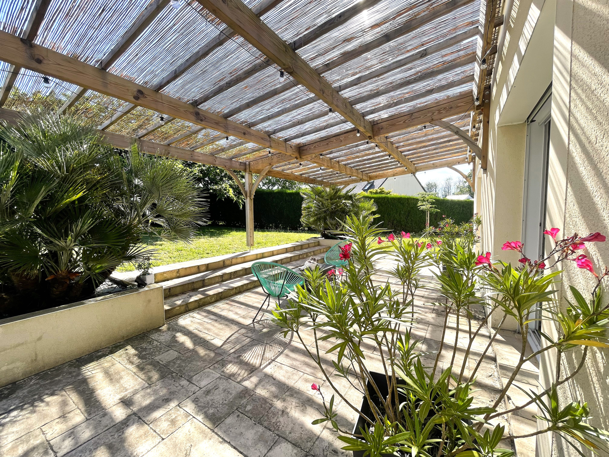 Vaste terrasse en pierres et belle pergola récente (10 m x 5 m).