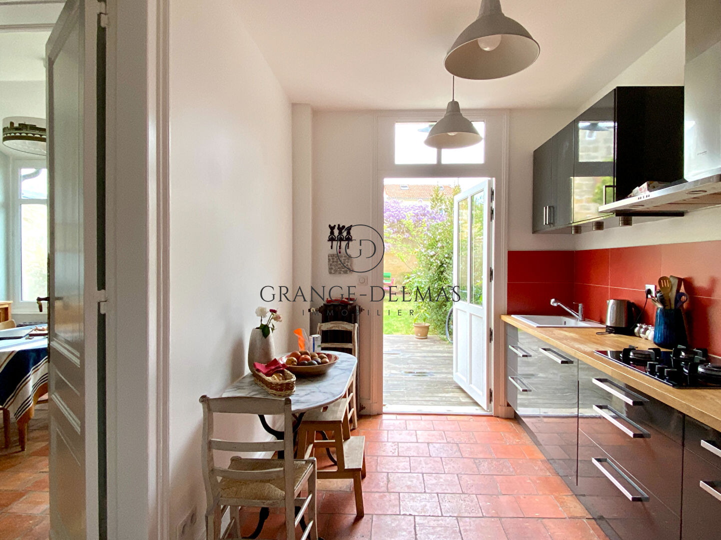 Au rez-de-chaussée, la vaste entrée avec carreaux de ciment dessert un agréable salon côté rue et une double réception en enfilade ayant conservé ses belles prestations d'origine avec parquet, tomettes anciennes et cheminée donnant de plain-pied sur un beau jardin bien exposé. La cuisine indépendante a également un accès au jardin.