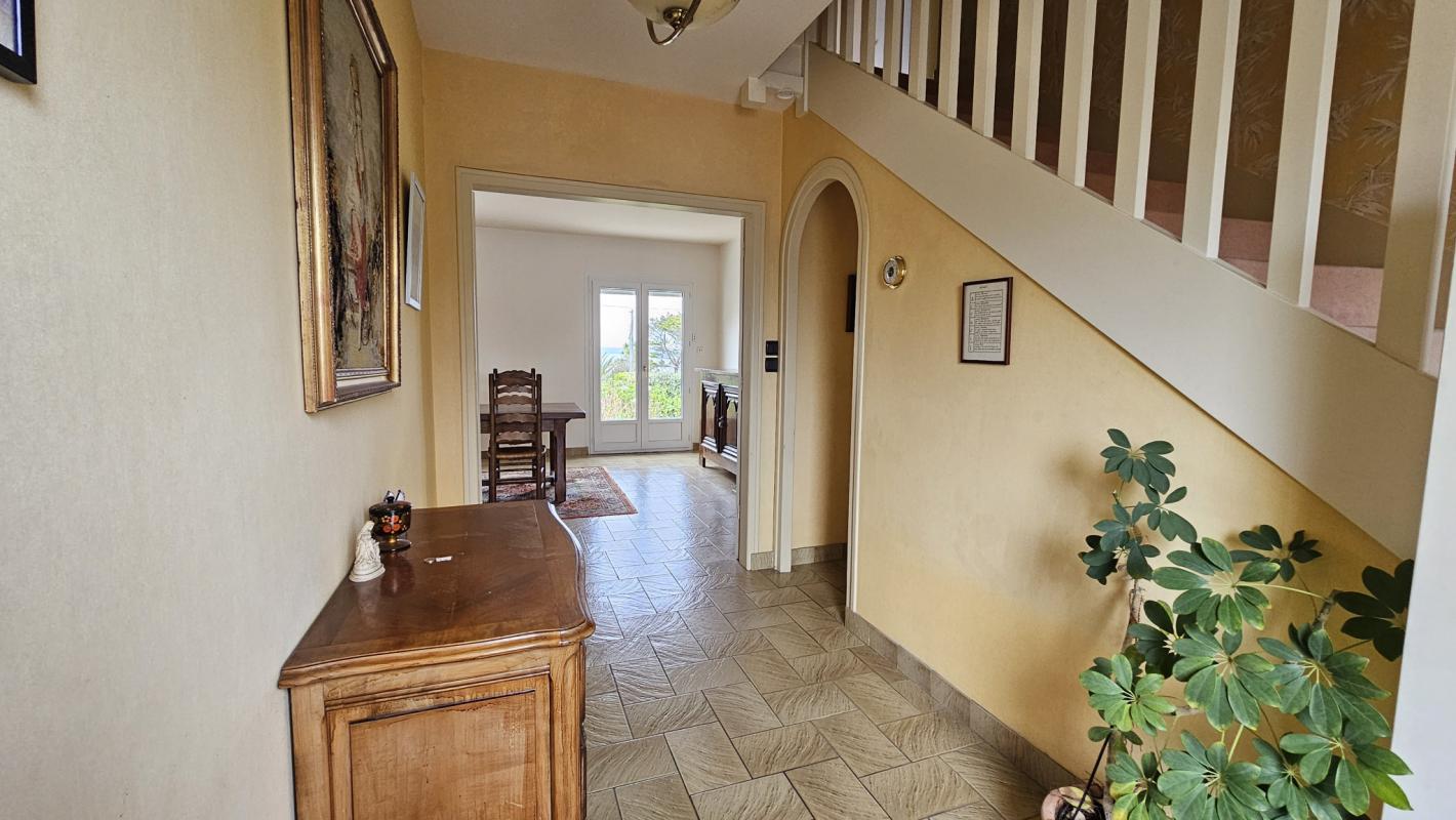 Située dans un environnement calme et agréable, cette belle maison de style néo-breton offre un cadre de vie idéal pour une famille en quête d'espace et de confort. Son agencement fonctionnel, ses volumes généreux et la petite vue mer sauront vous séduire. Le rez-de-chaussée se compose d'un salon-séjour baigné de lumière, offrant un espace de vie chaleureux et convivial. La cuisine équipée vous permettra de préparer de délicieux repas en toute simplicité. Toujours sur ce niveau, une chambre avec coin douche offre un confort appréciable, complété par un WC indépendant. À l'étage, vous disposerez de quatre chambres et une salle de bain, idéales pour accueillir famille et amis. Un WC indépendant ainsi qu'un débarras complètent cet espace. La maison repose sur un sous-sol complet, offrant un vaste espace de rangement et de multiples possibilités d'aménagement. Le tout est implanté sur un terrain agréable,clos et arboré, parfait pour profiter des beaux jours en extérieur.