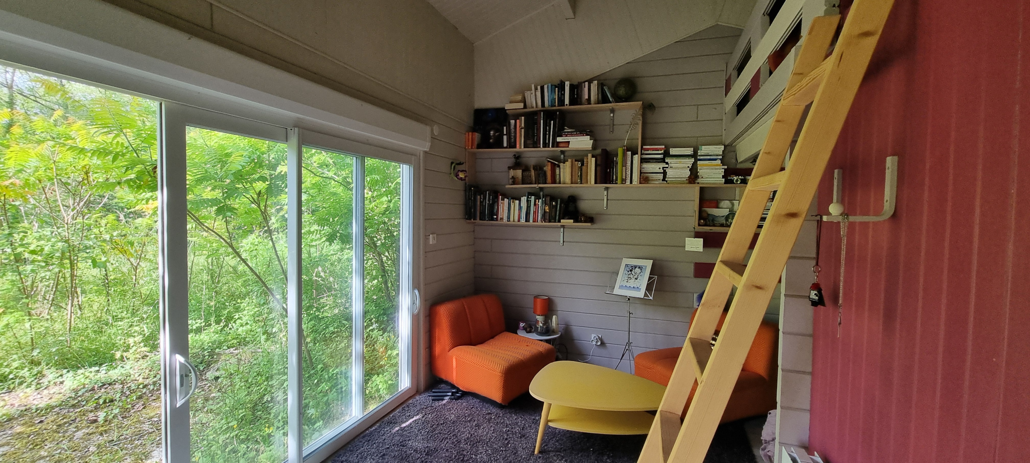 Deuxième chalet de 20 m2 : chambre avec mezzanine, salle d'eau avec WC et appentis.