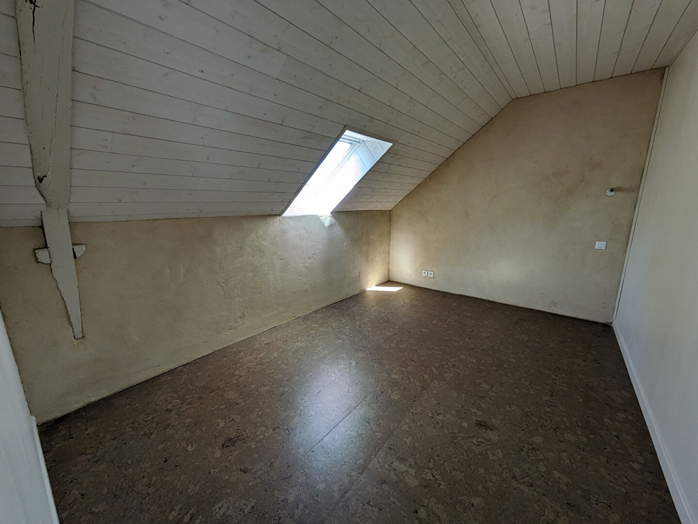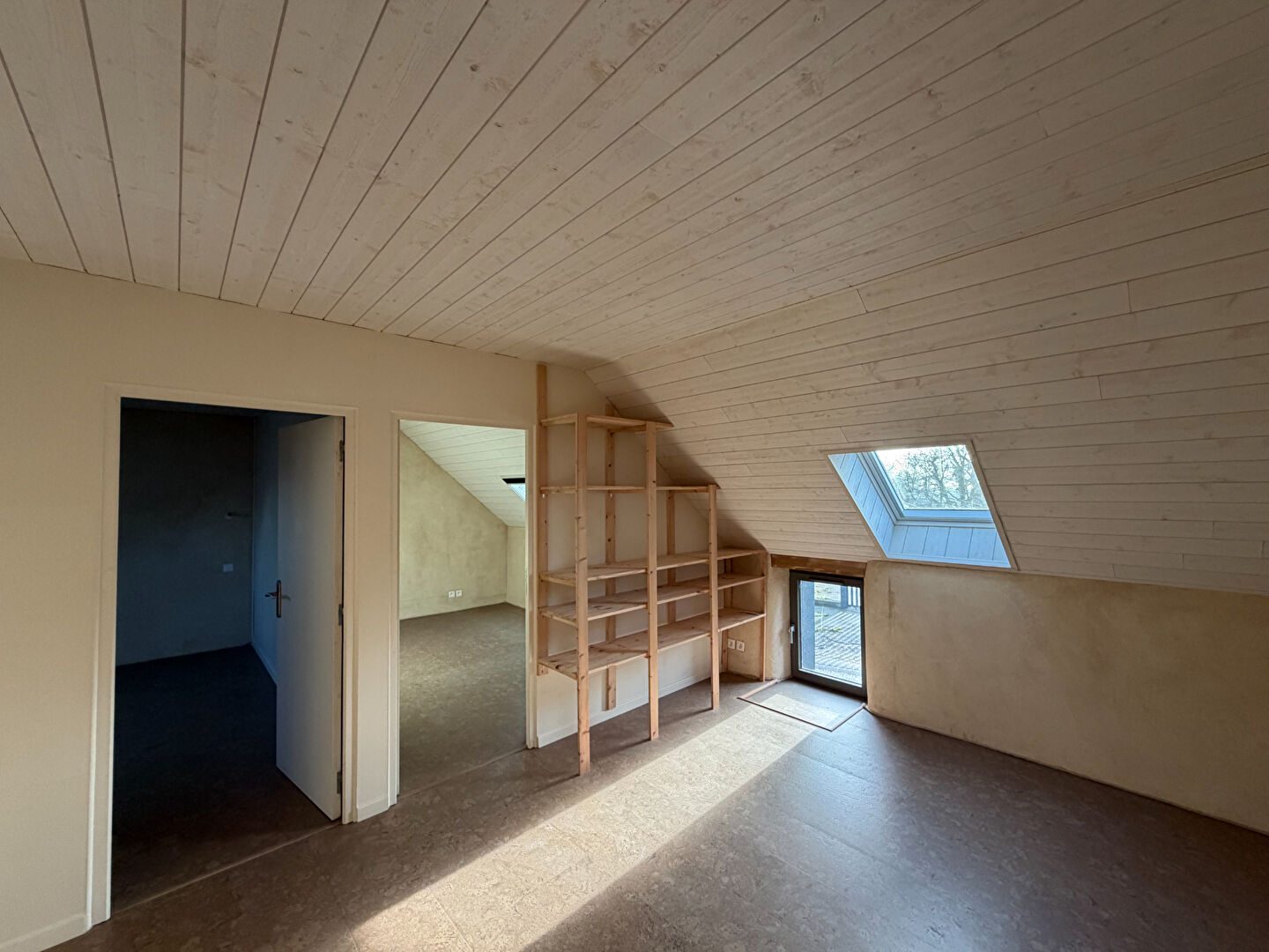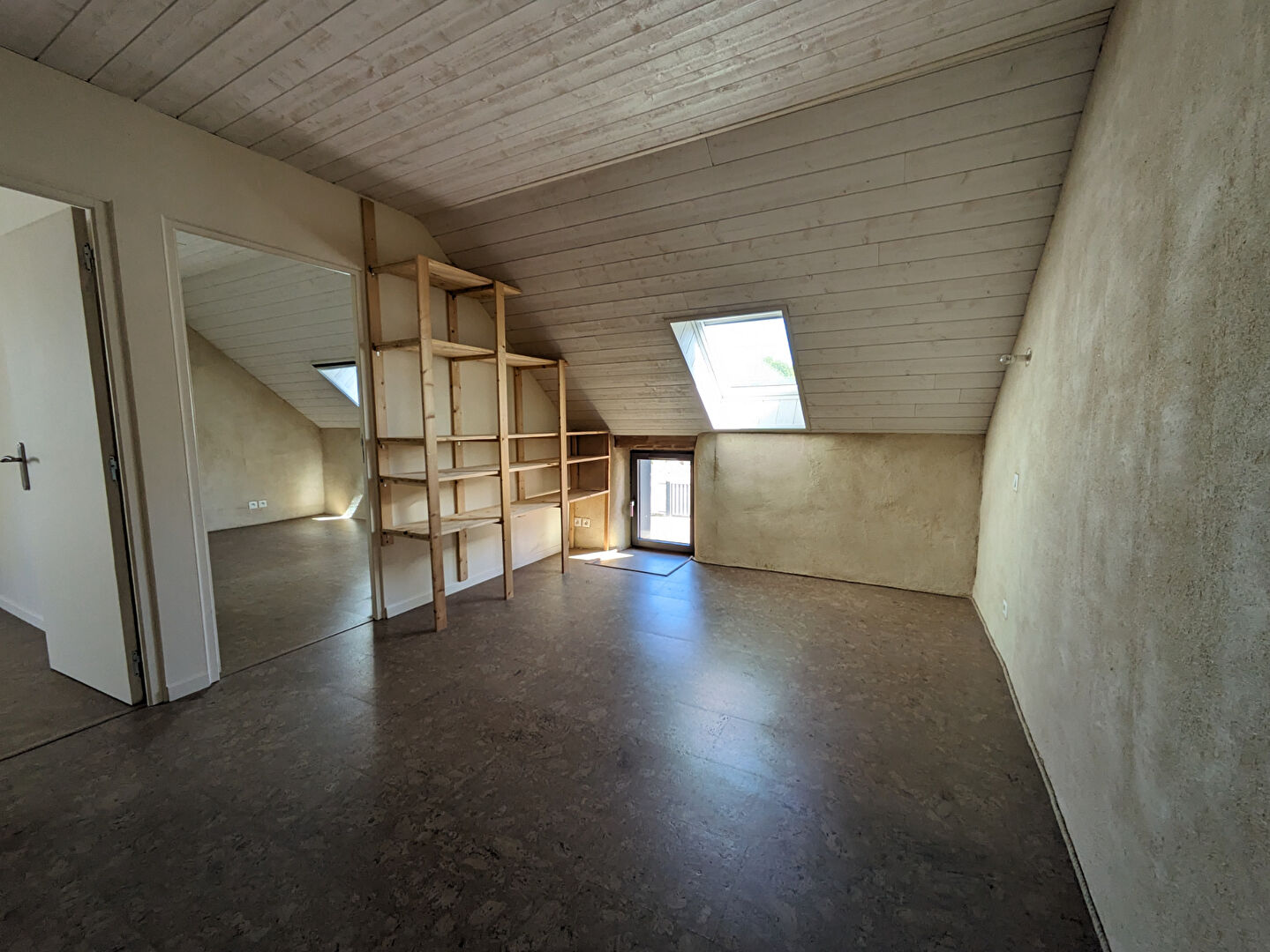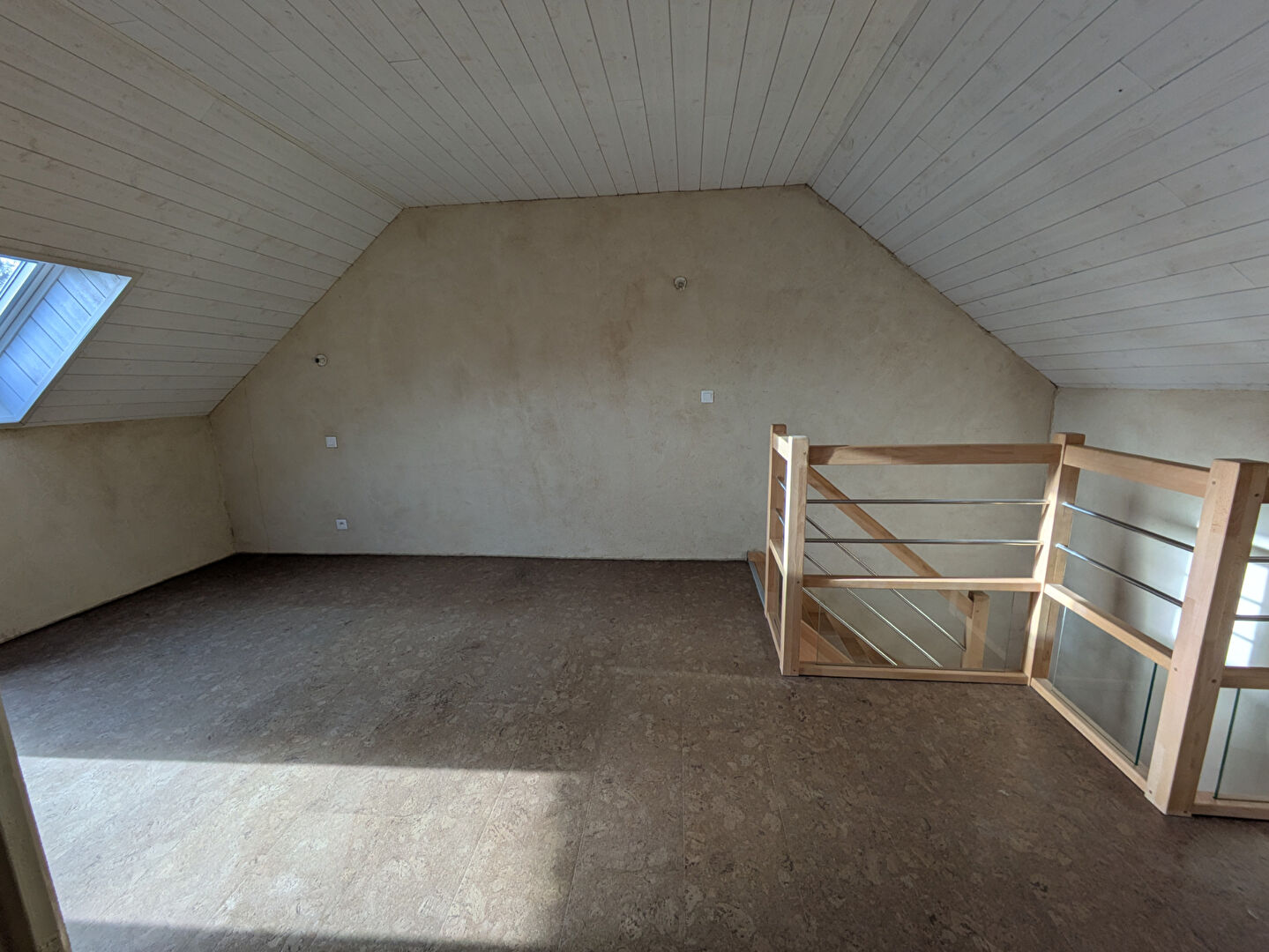 À l'étage : mezzanine avec toilette sèche, 2 chambres mansardées. Sol en liège.