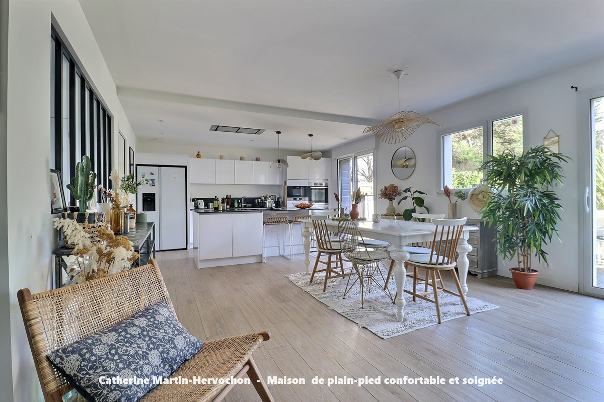 Loire-Atlantique, St André des Eaux (44117), à proximité du Golf International de La Baule (44500), au calme d'une impasse, Catherine Martin-Hervochon vous présente, en exclusivité : Maison de plain-pied très lumineuse, rénovée en 2012, proposant une pièce de vie de plus de 54 m² complétée d'une arrière-cuisine/buanderie, 3 chambres dont 1 de 14 m² avec très grand placard/dressing, WC séparés et salle de bains (double vasque, baignoire et douche à l'italienne). La réception est en accès direct sur une vaste terrasse de 58 m² prolongée d'un joli jardin paysager clos - Budget 538.420 euros hors honoraires d'agence d'un montant de 21.480 euros, soit 559.900 euros HAI (3,99% TTC, charge acquéreur).