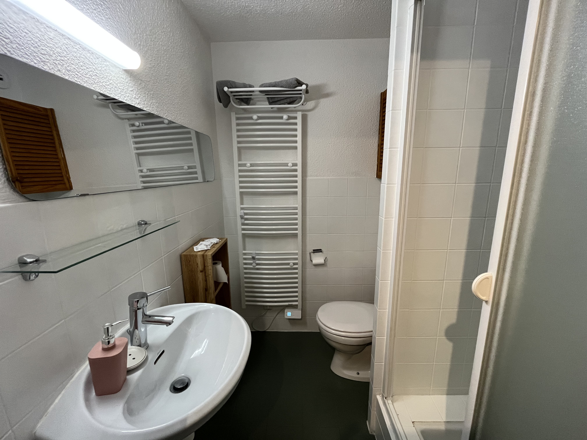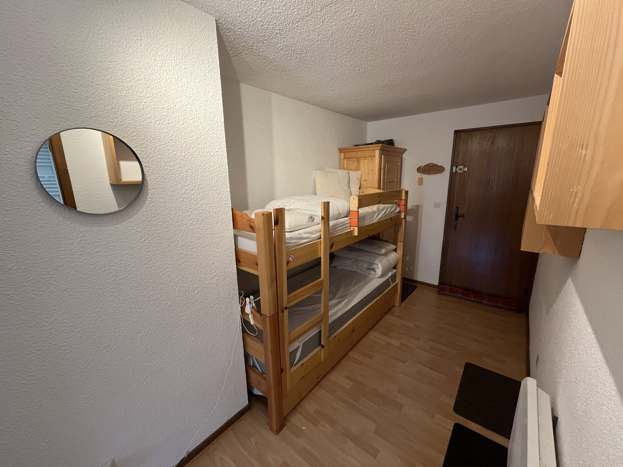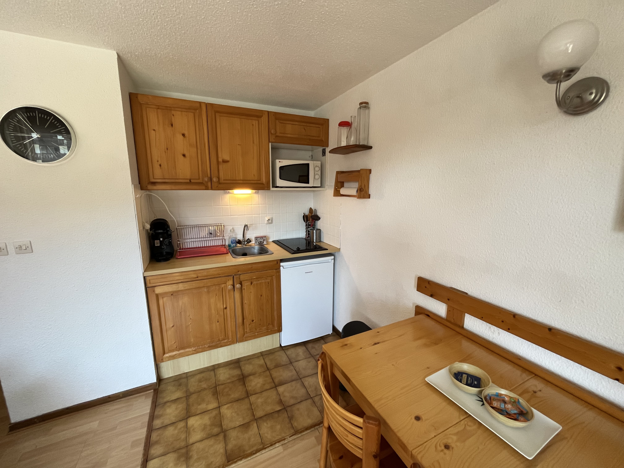 L'appartement dispose d'une entrée de 7,60 m2 avec coin nuit et lits superposés, d'une salle d'eau avec WC de 3 m2, d'un dégagement avec un grand placard et d'un lumineux séjour de 13 m2 doté d'un confortable canapé lit et d'un coin kitchenette ouvrant sur la terrasse.