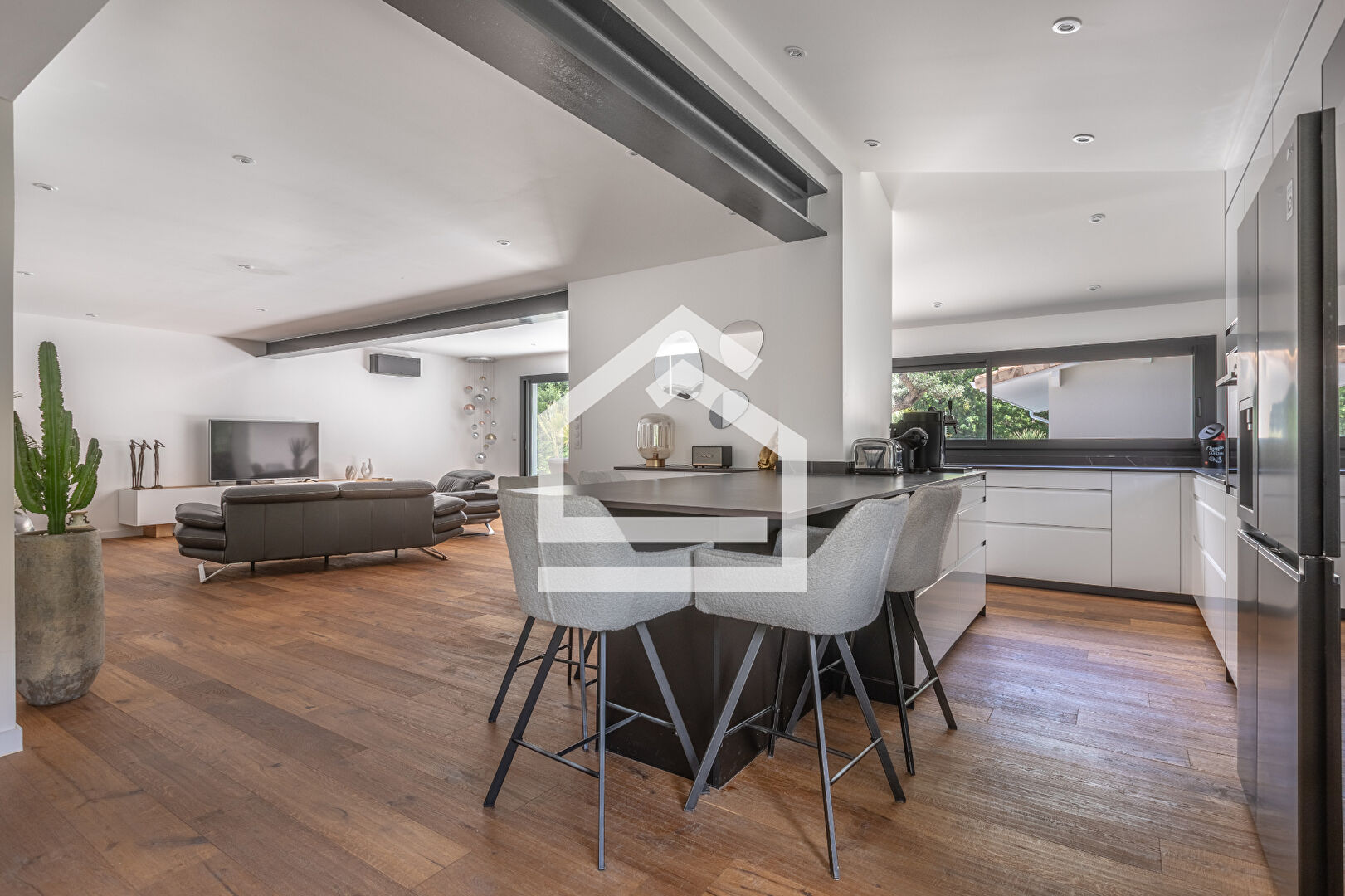 La maison propose une entrée spacieuse avec placards, une magnifique pièce de vie avec salon, salle à manger et cuisine aménagée et équipée. La rénovation de qualité en fait un lieu exceptionnel avec une vue sur le jardin et la piscine.