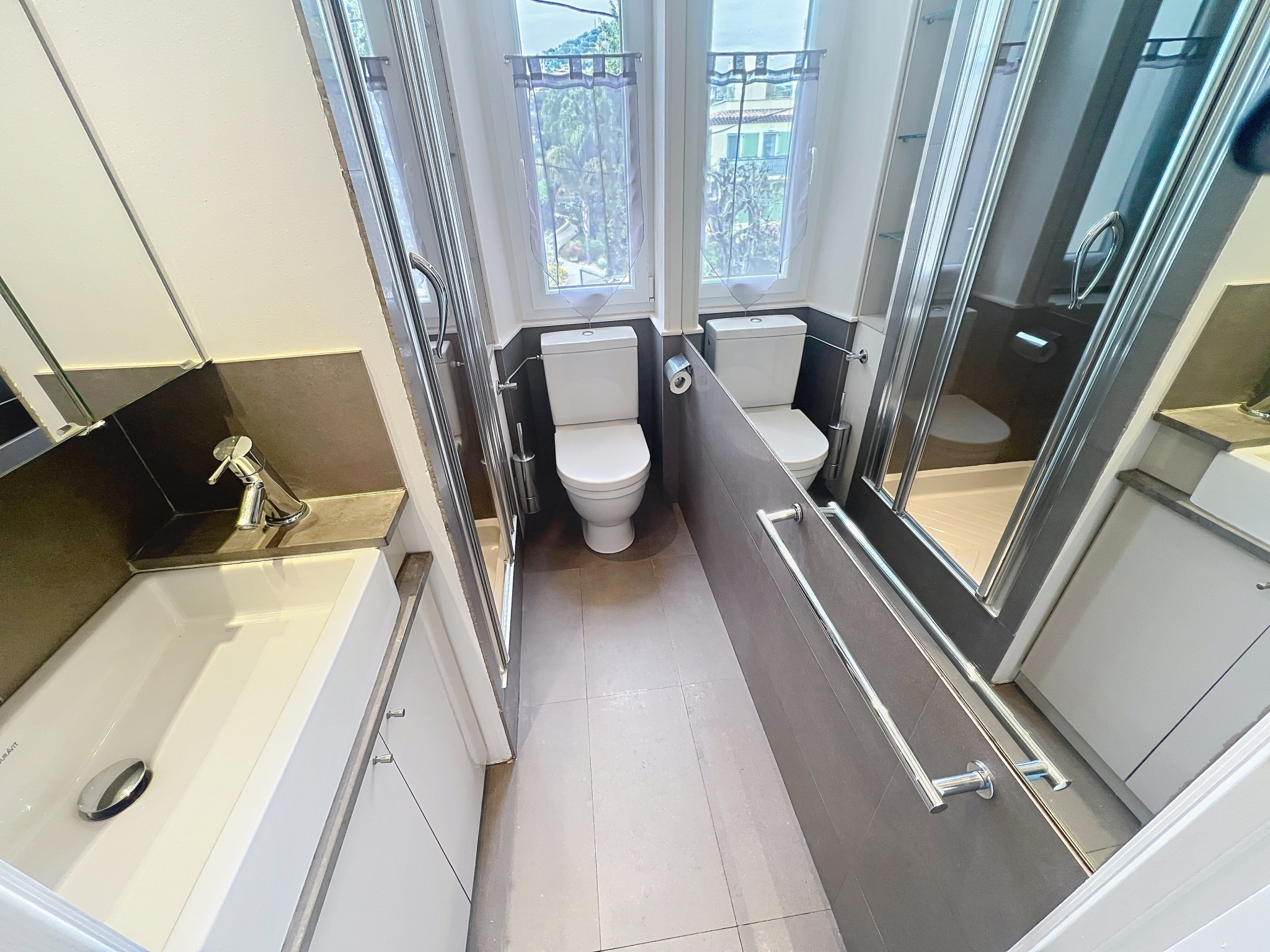 CANNES, secteur résidentiel de Montfleury, dans petite résidence bourgeoise de 29 privilégiés, au sein d'un beau jardin commun paysagé, au calme absolu et sans vis-à-vis, appartement de charme refait à neuf, traversant, séjour SUD avec vue mer et Esterel, une chambre et un bureau. Parking sécurisé. A 5 minutes de tous commerces. Croisette à 10 minutes.