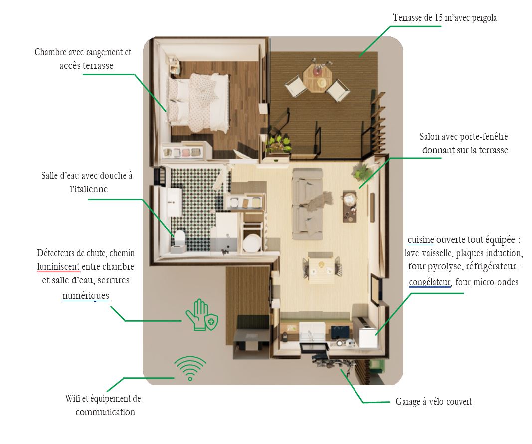Dans un cadre naturel de 3 hectares, sécurisé par contrôle d'accès, il est composé de 17 maisons individuelles de plain-pied de type T2 de 45 m2, avec terrasse et place de parking privative, disposées sans vis-à-vis pour préserver la tranquillité de chacun. Il allie ainsi en toute harmonie votre intimité avec la vie sociale d'un lieu accueillant et chaleureux.