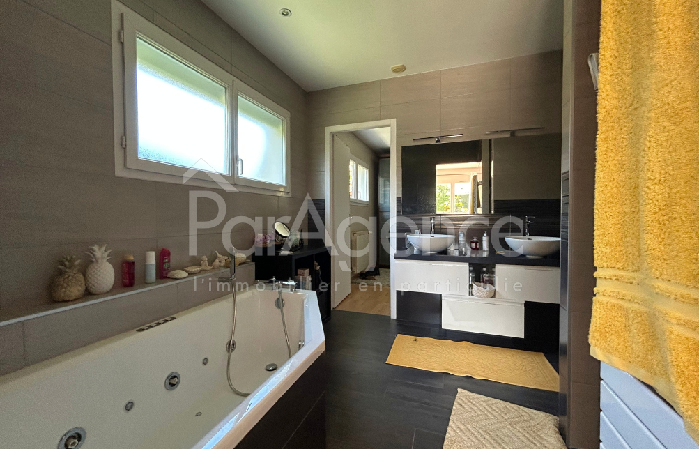 À l'étage, le palier dessert trois chambres avec placards, une salle d'eau et un wc. Le confort est assuré par le chauffage au gaz de ville et la climatisation réversible. Un garage double de 40 m2 avec galta complète ce bien aux nombreuses prestations soignées.