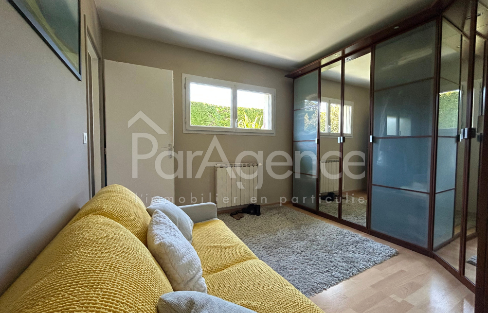 Au rez-de-chaussée, un hall d'entrée avec placard accueille vers un séjour lumineux ouvrant sur terrasse et véranda, avec stores électriques, donnant sur le jardin et la piscine. La cuisine équipée s'ouvre également sur la terrasse. Une chambre ou dressing, une chambre avec placard donnant sur terrasse et une salle de bains avec baignoire balnéo, douche et wc complètent ce niveau.