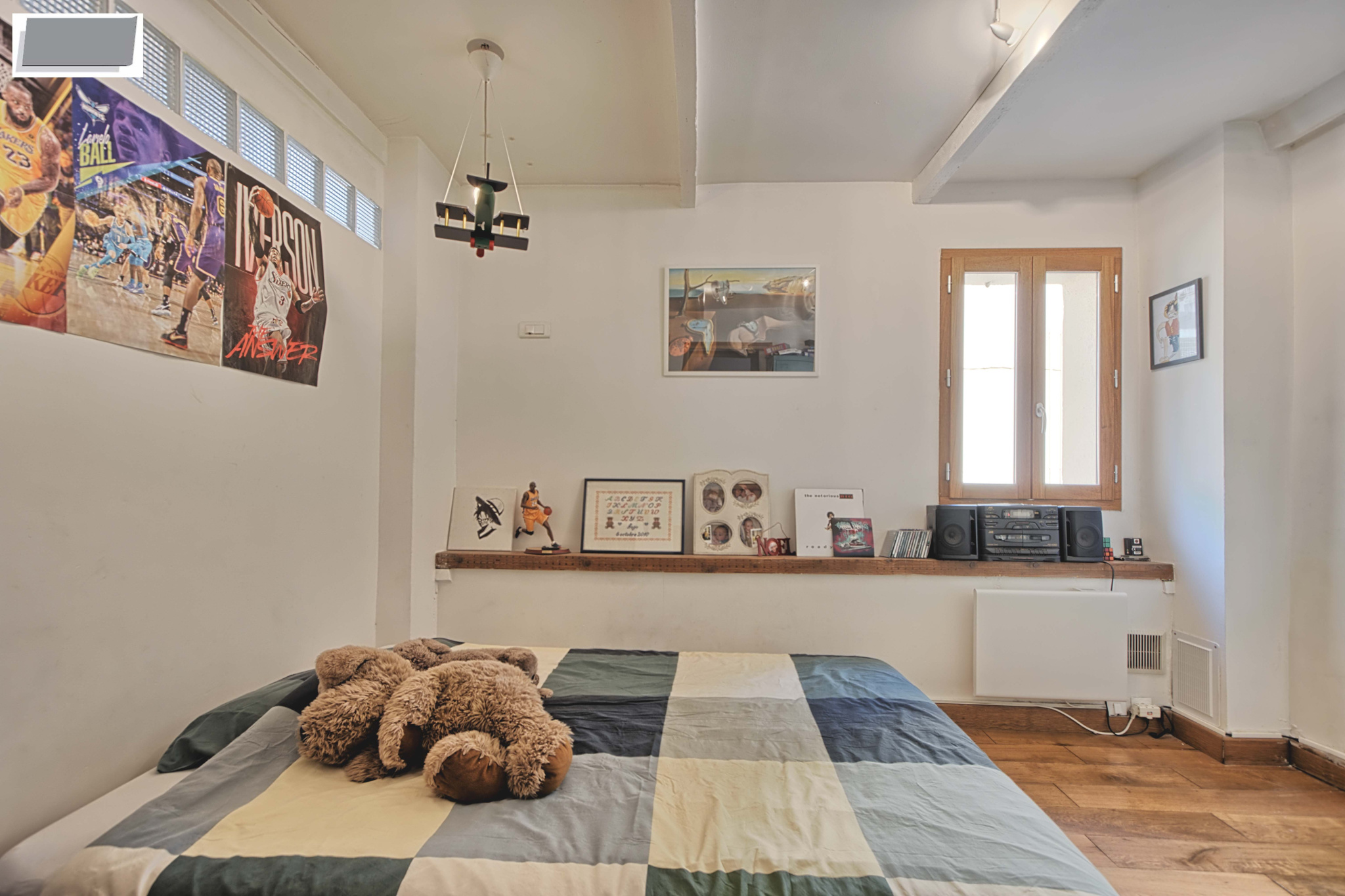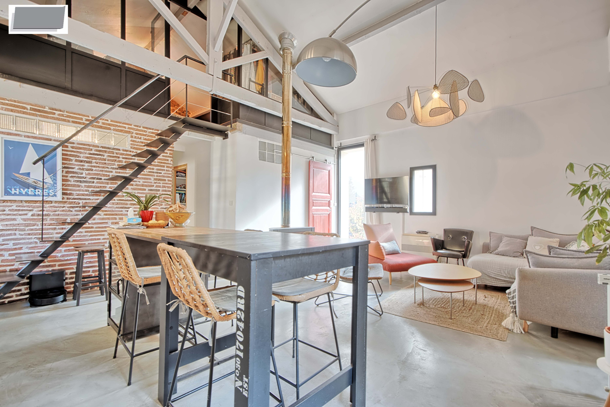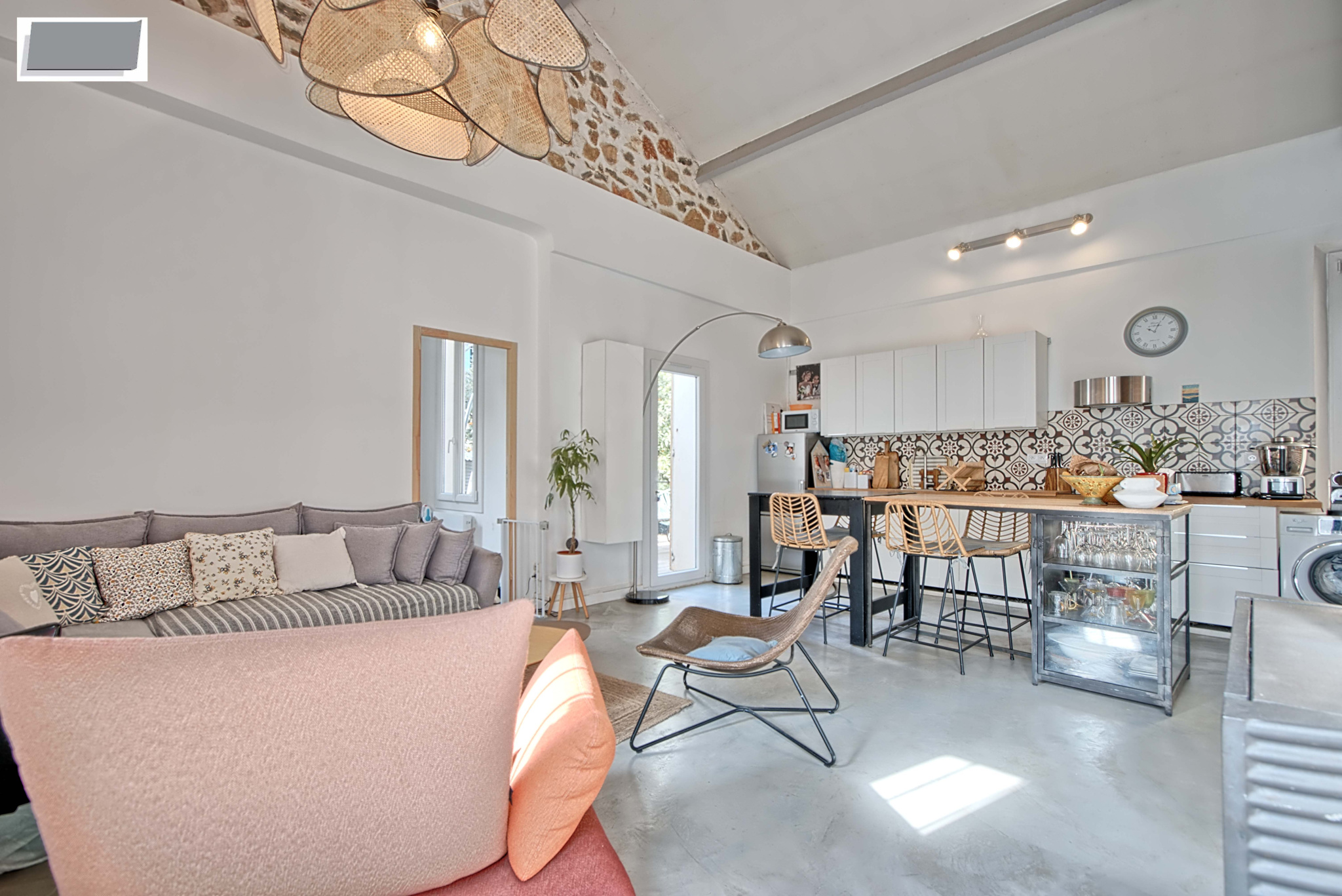 Elle se compose d'un magnifique séjour cathédrale avec cuisine ouverte et accès sur une terrasse et le jardin arboré de 434 m2, deux chambres et un bureau en rez de chaussée, salle d'eau, wc et rangements. A l'étage, une belle et grande mezzanine sous les toits faisant office de chambre parentale.