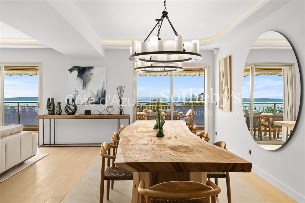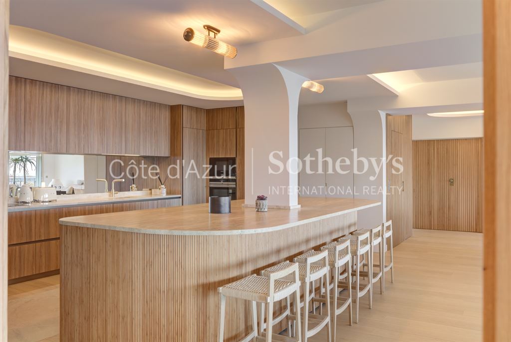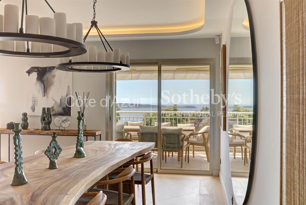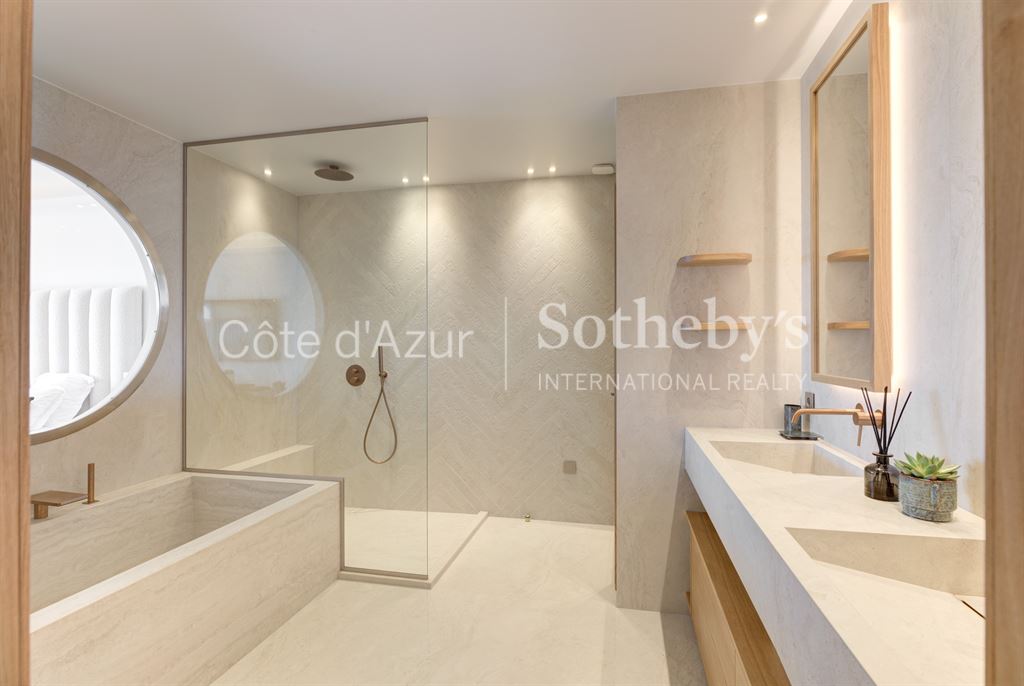 Les volumes généreux sont prolongés par de nombreuses terrasses et un jardin privé avec jacuzzi, offrant une vue mer panoramique sur les îles de Lérins, le Palm Beach et la Méditerranée. Exposition plein sud.
