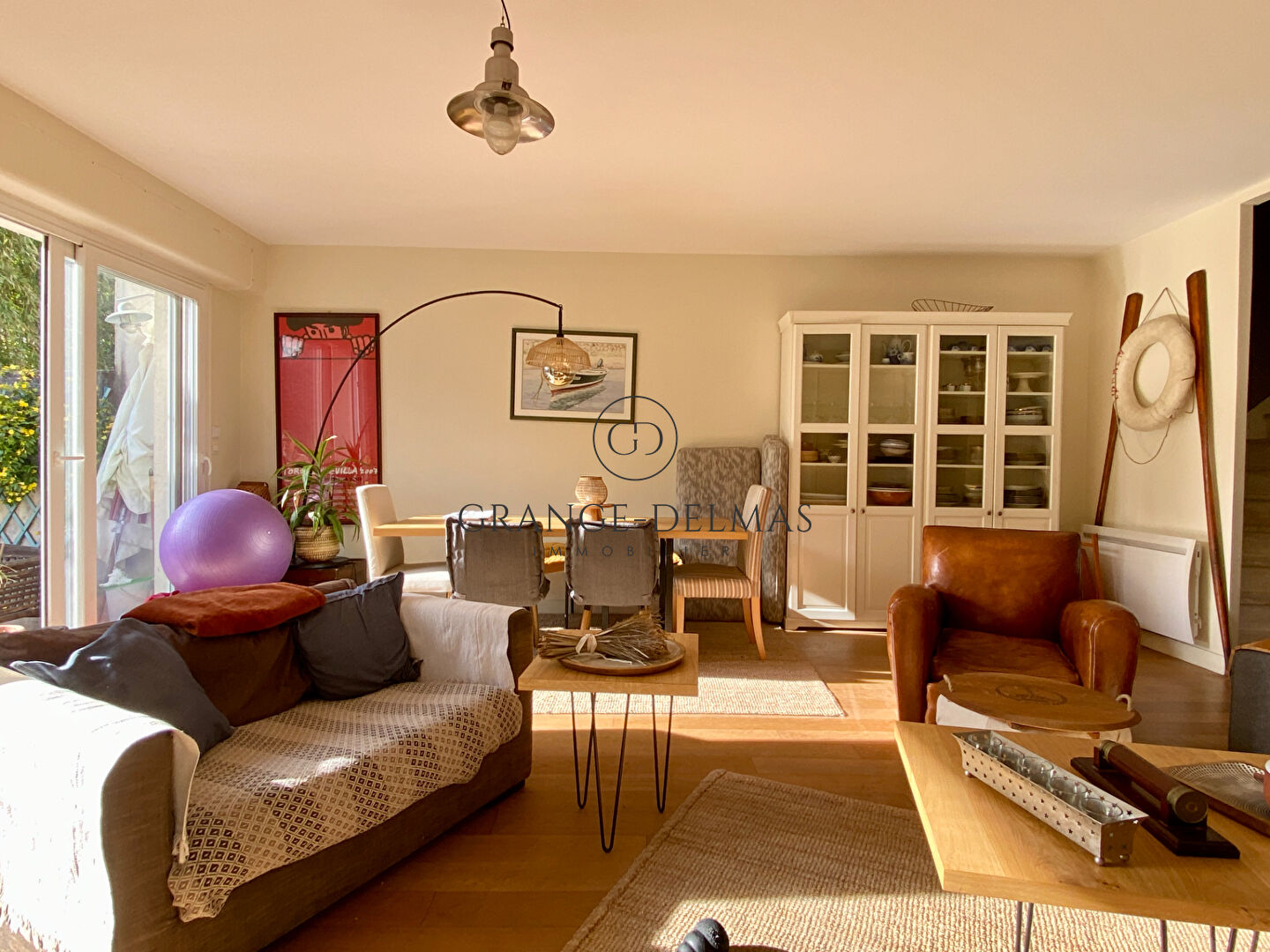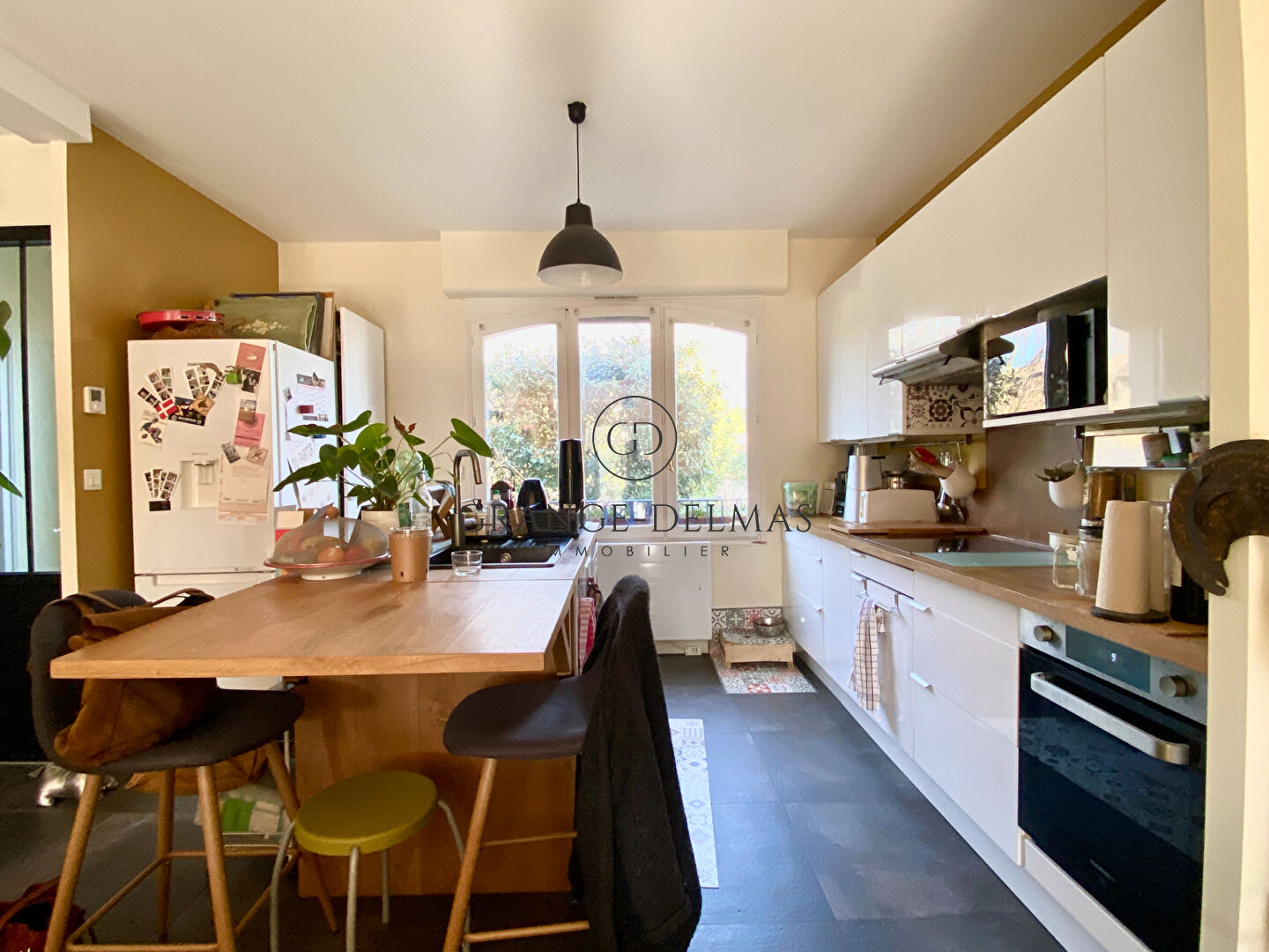 Au rez-de-chaussée surélevé, l'entrée dessert une cuisine ouverte sur la grande pièce de vie avec parquet et cheminée donnant sur le jardin bien exposé par de larges baies vitrées.