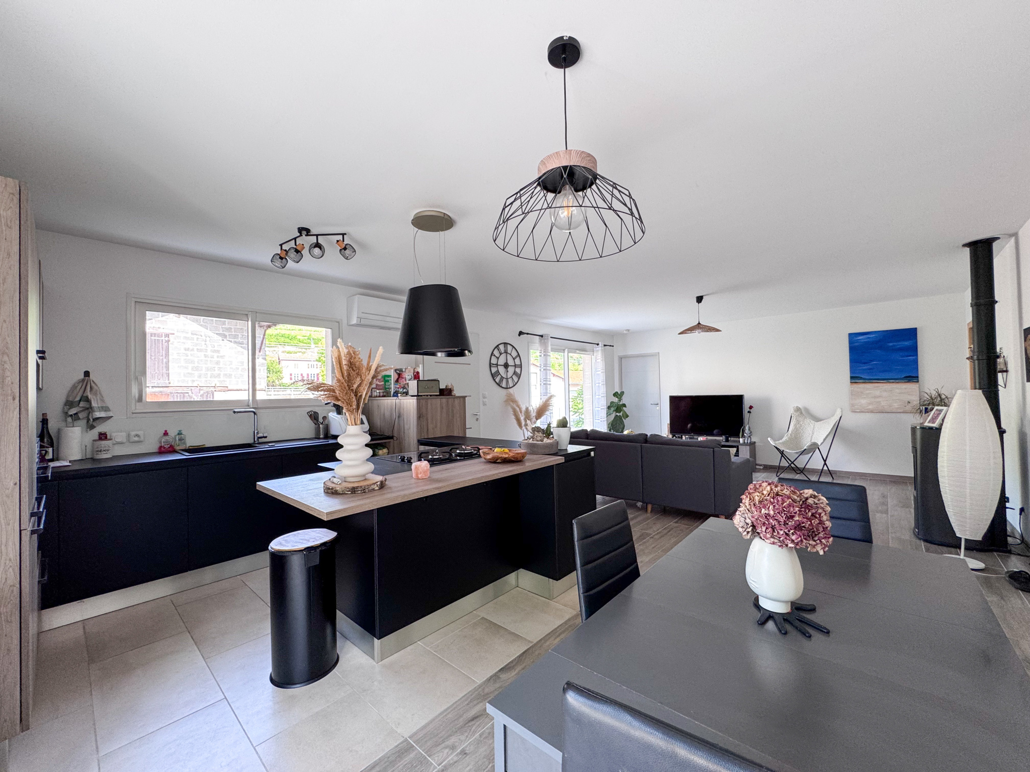 Le poêle à granulés et climatisation réversible, installés au coeur de cet espace de vie, apporte chaleur et confort tout au long de l'année.