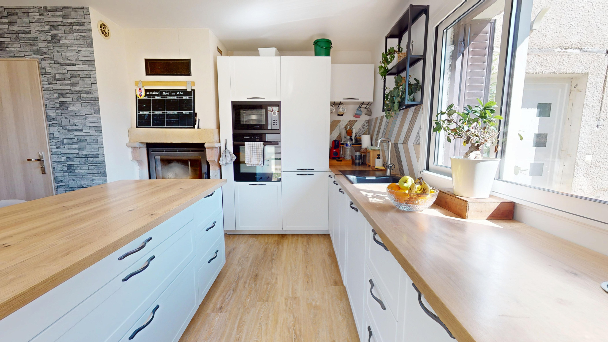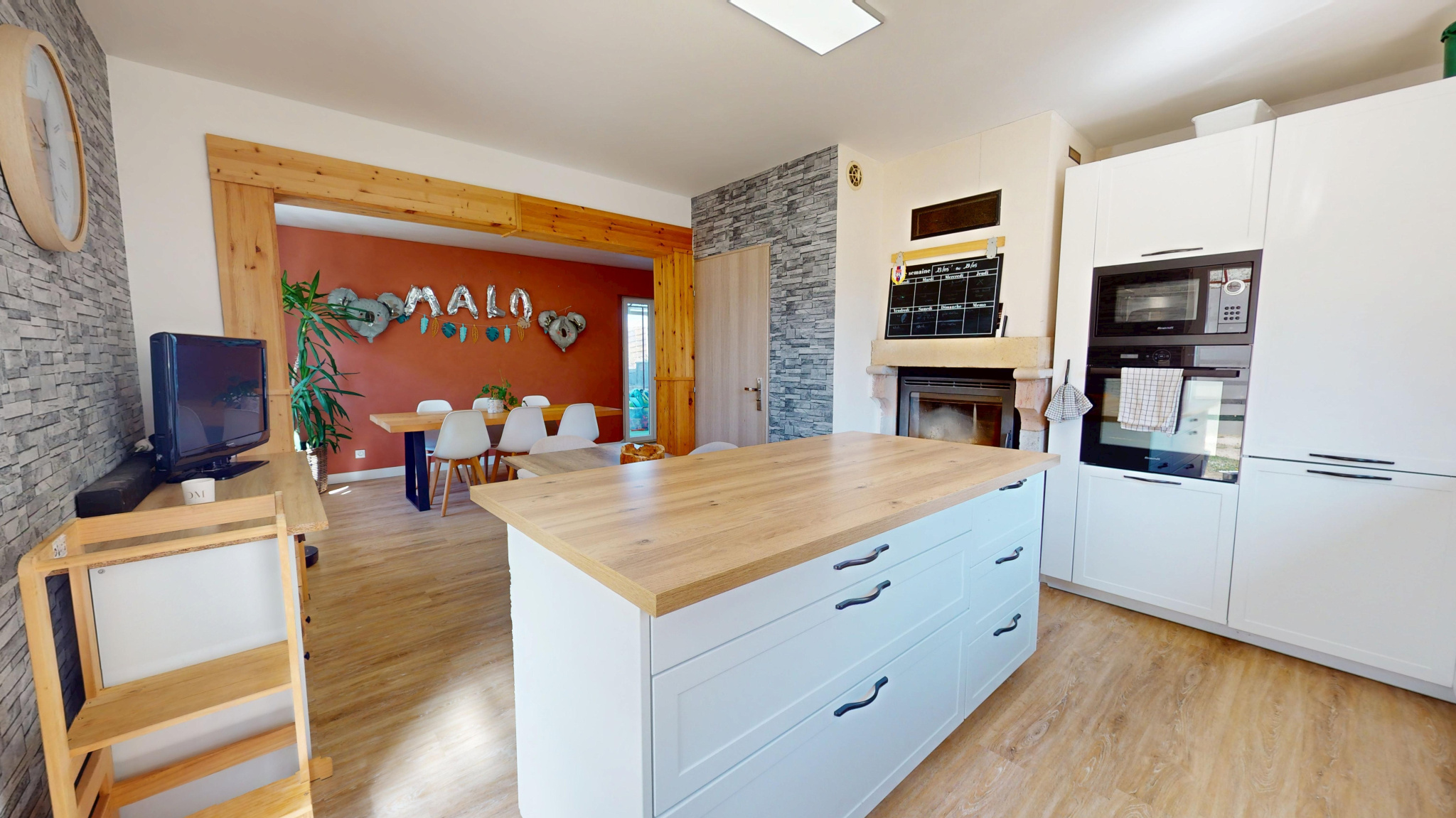 Au rez-de-chaussée : entrée avec poêle à granulés, salon, couloir desservant un bureau et une grande pièce de vie lumineuse avec cuisine ouverte et équipée, buanderie, wc et véranda.