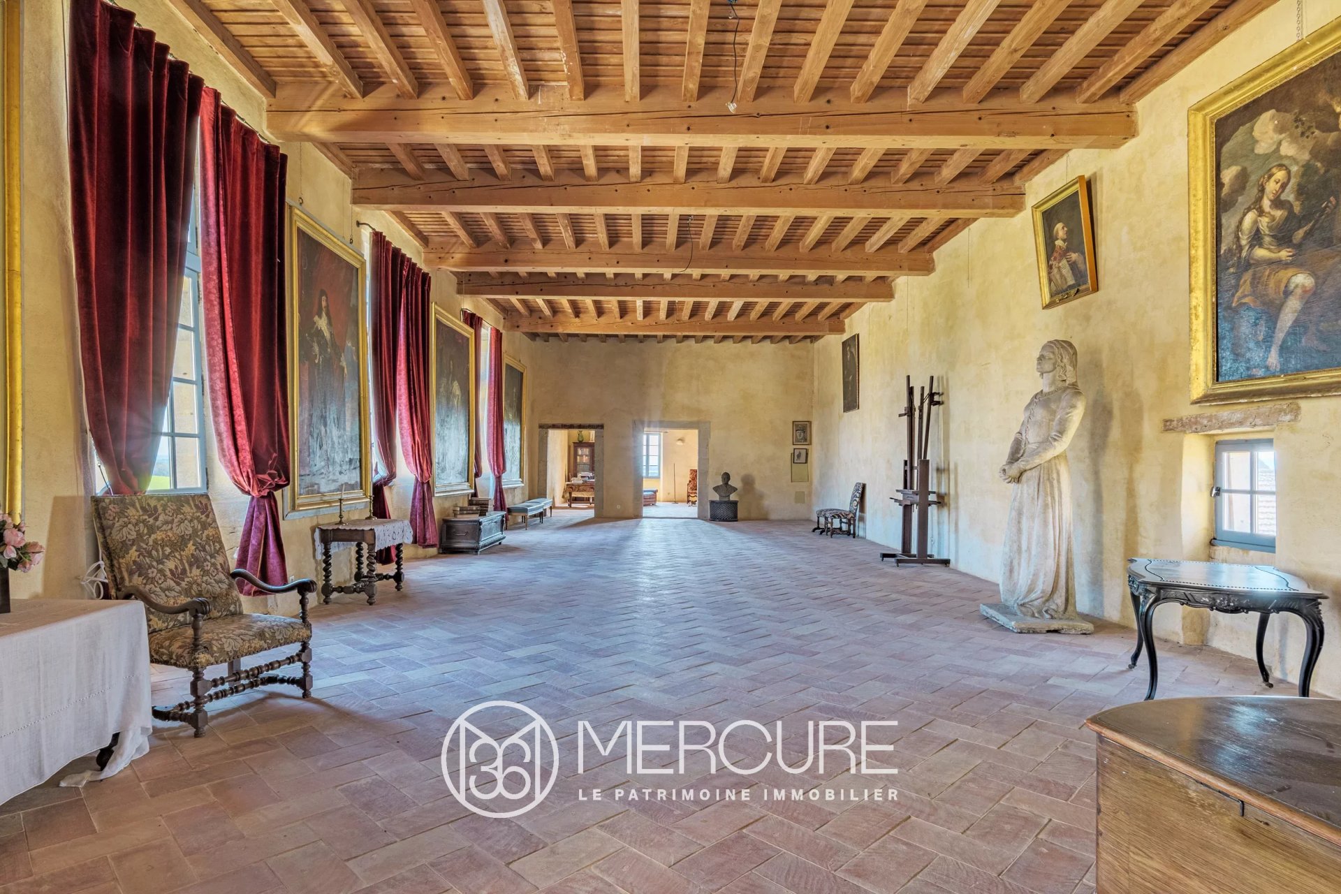 Dans la partie rénovée, au premier étage, se trouvent à droite, une entrée bibliothèque, deux chambres et leurs salles de bain, un dressing. Sur la gauche, une immense galerie mène à un beau salon dans le donjon qui surplombe la campagne alentour au sud, et abrite deux chambres et leurs salle de bain au deuxième étage.