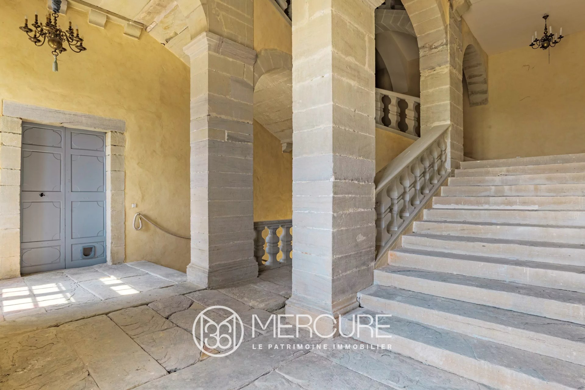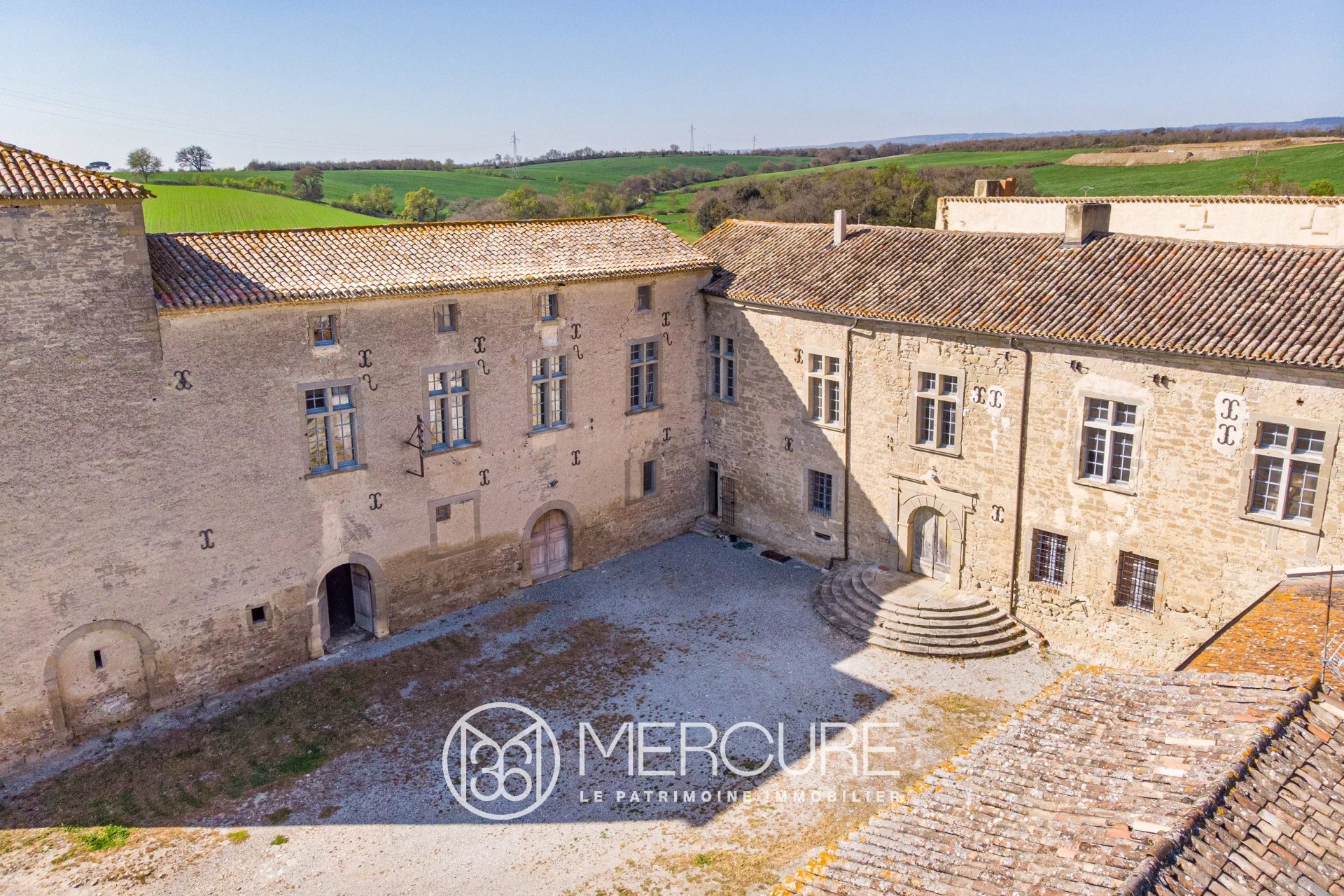 On entre dans l'enceinte du château par une cour d'honneur avec un large perron de pierre donnant sur une belle entrée voutée, prolongée par un magnifique escalier monumental à balustre du XVIIIè siècle, qui dessert une partie entièrement rénovée à l'ouest et une partie à finir de rénover à l'est.