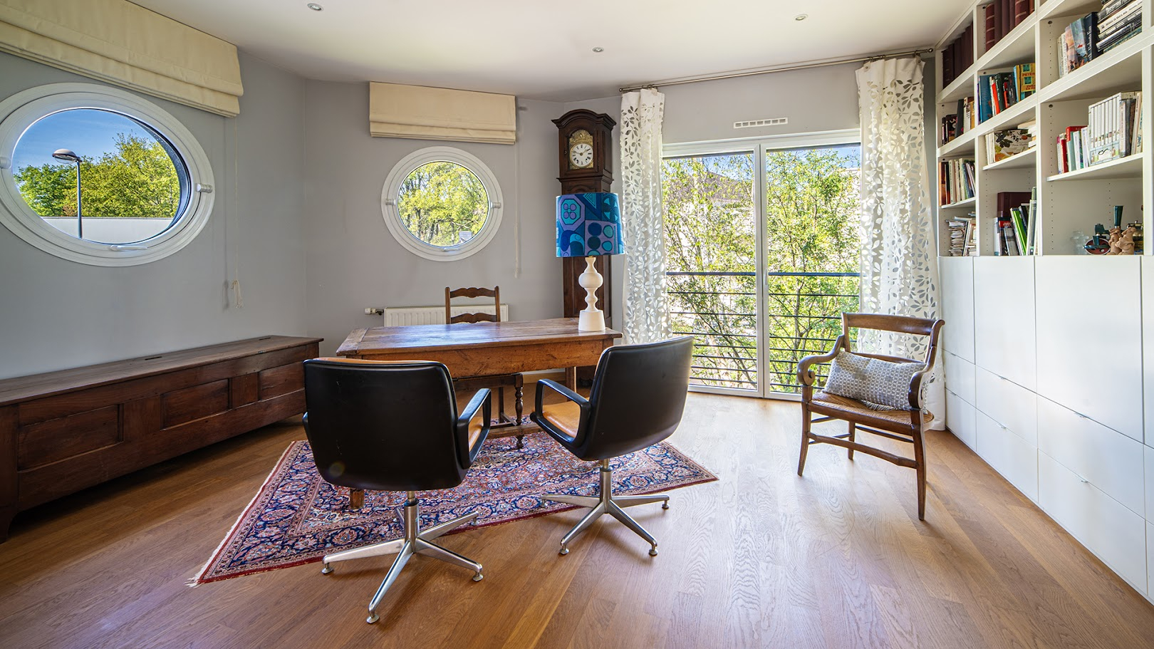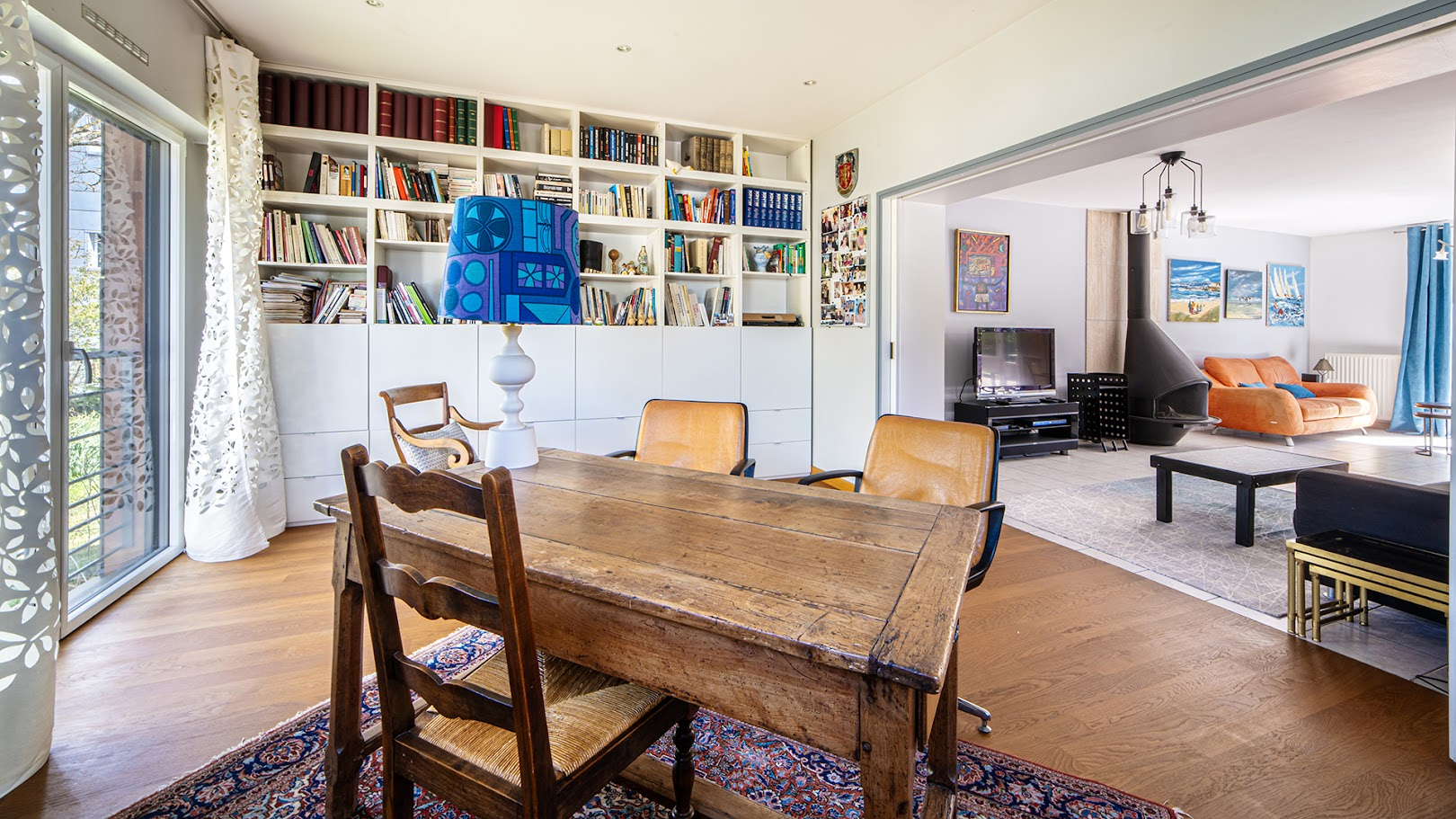 Pensée pour le confort et la fonctionnalité, elle offre au premier étage, de plain-pied sur le jardin, une entrée avec rangements, une vaste pièce de vie traversante et baignée de lumière, avec cheminée, prolongée par une terrasse exposée sud, un espace bureau-bibliothèque, une cuisine ouverte aménagée et équipée, buanderie, WC séparés.