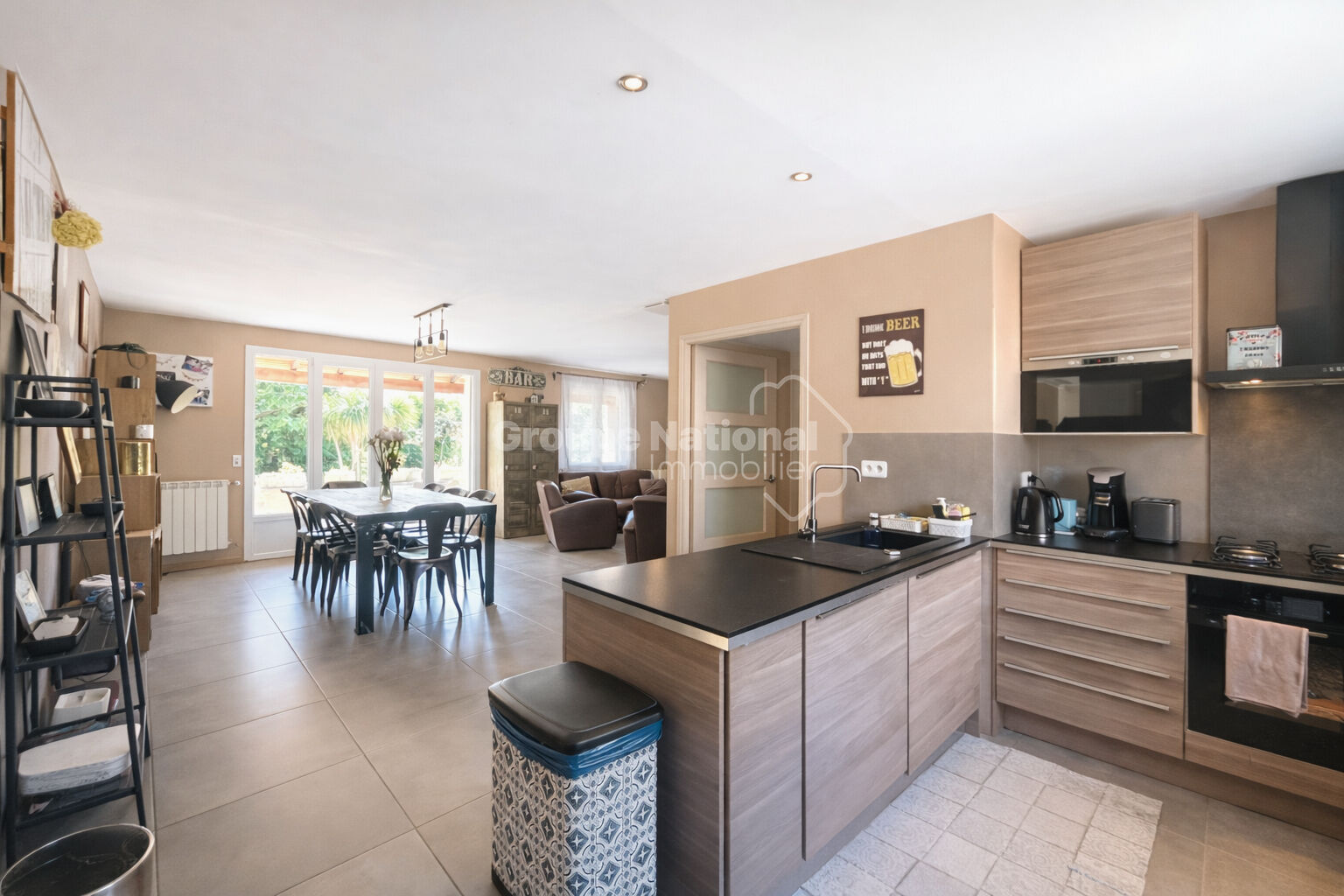 Située dans un jardin arboré, villa fonctionnelle de plain pied d'environ 120 m2. Elle se compose d'un hall d'entrée desservant un espace de vie lumineux avec cuisine ouverte sur vaste séjour. Côté nuit, vous trouverez 4 chambres dont une suite parentale avec sa salle d'eau, une salle d'eau indépendante et dressing. Buanderie et nombreux rangements. Grand terrain de presque 1700 m2 sans vis-avec avec piscine pour vos moments de détente. Atout supplémentaire un garage.