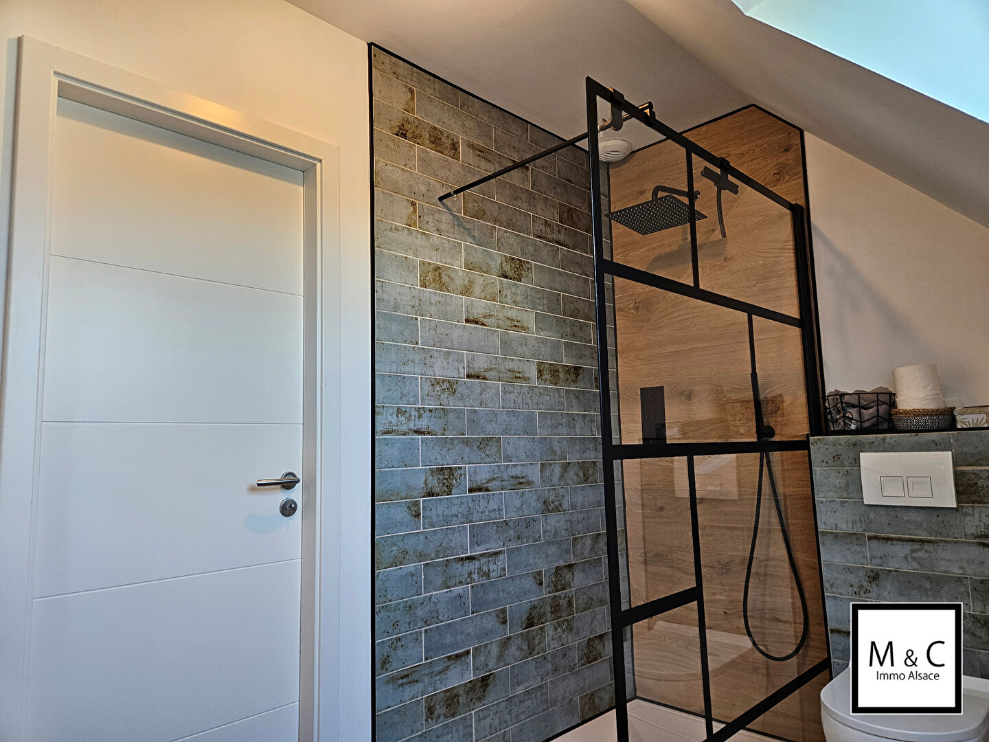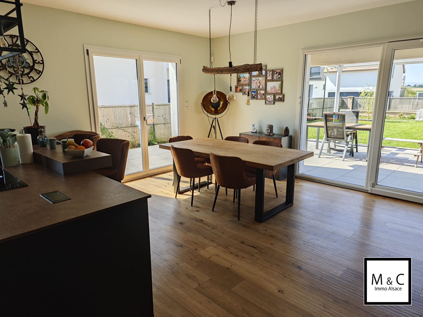 Au rez-de-chaussée, l'entrée dessert une spacieuse pièce de vie de 43 m² composée d'un salon-séjour lumineux et d'une cuisine américaine entièrement équipée, le tout avec un accès direct à la terrasse et à l'espace extérieur. Un WC séparé complète ce niveau.