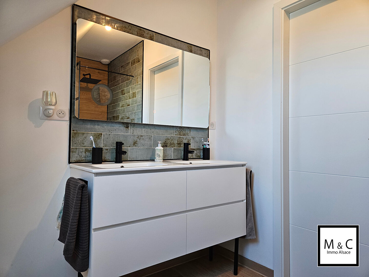 Un double garage de 32 m² avec porte sectionnelle motorisée, une cave avec espace de stockage et coin buanderie, ainsi que deux places de stationnement extérieures complètent ce bien.