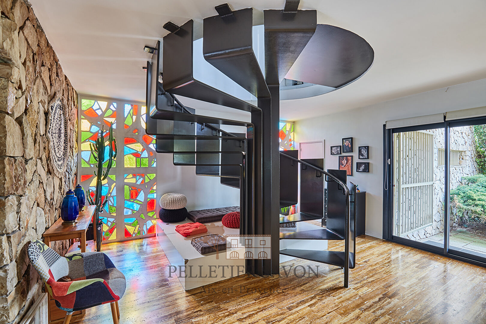 Des vitraux en verre de Murano, colorés et lumineux, ponctuent les deux niveaux de la maison, apportant une touche artistique et singulière à l'ensemble.
