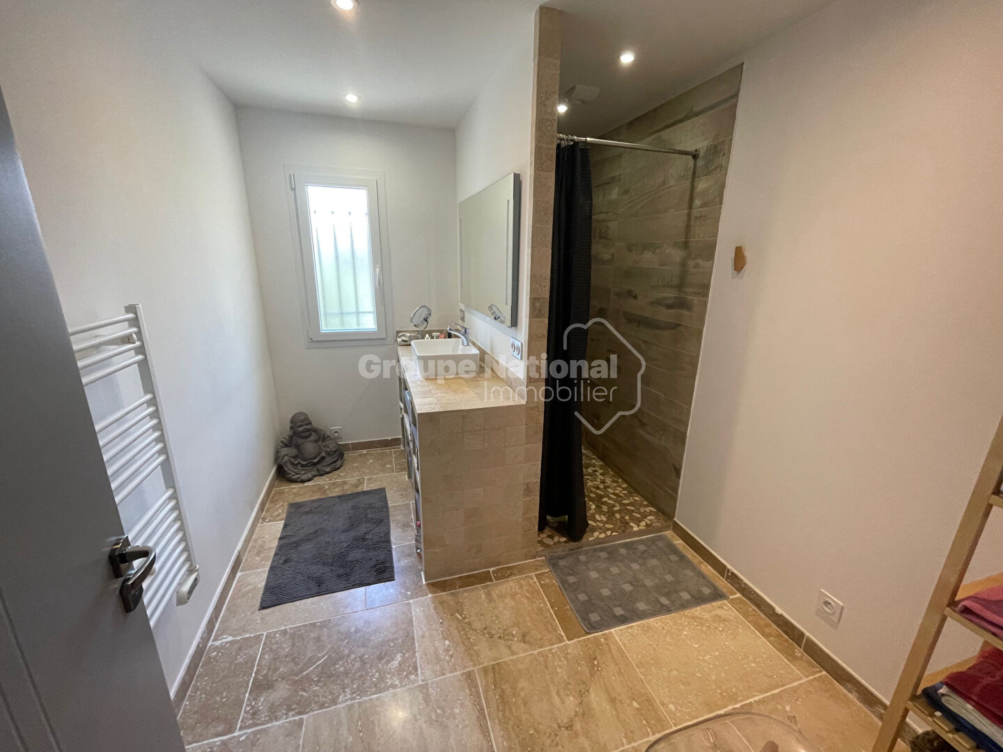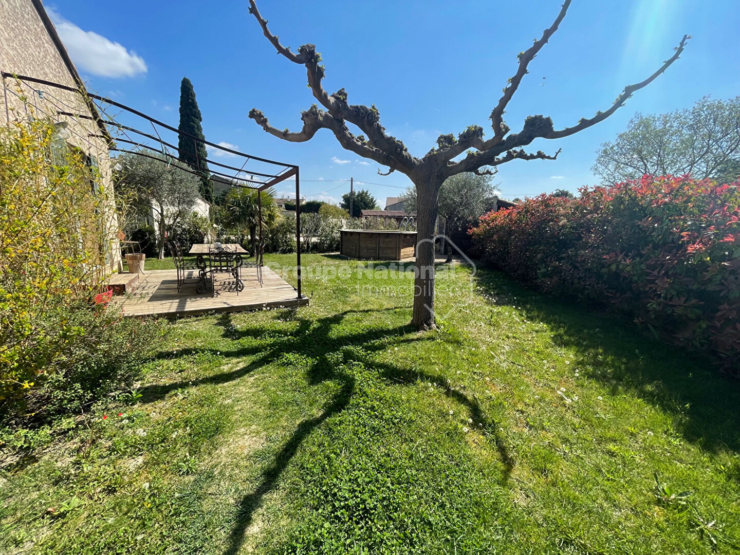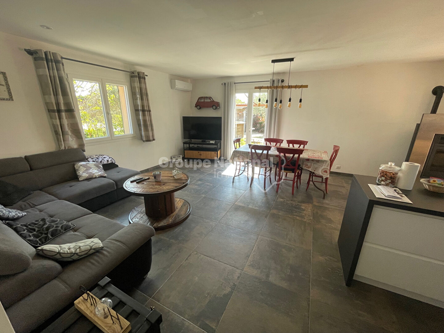A Sarrians, au calme en fond d'impasse belle maison de plain-pied avec : cuisine meublée et équipée ouverte sur la pièce à vivre, grand salon, terrasse, 4 chambres, 2 salles d'eau, une salle de jeu / bureau, un jardin clôturé, menuiseries pvc double vitrage, climatisation réversible, poêles à bois, exposition sud, portail automatique?. Proche commerces et commodités.