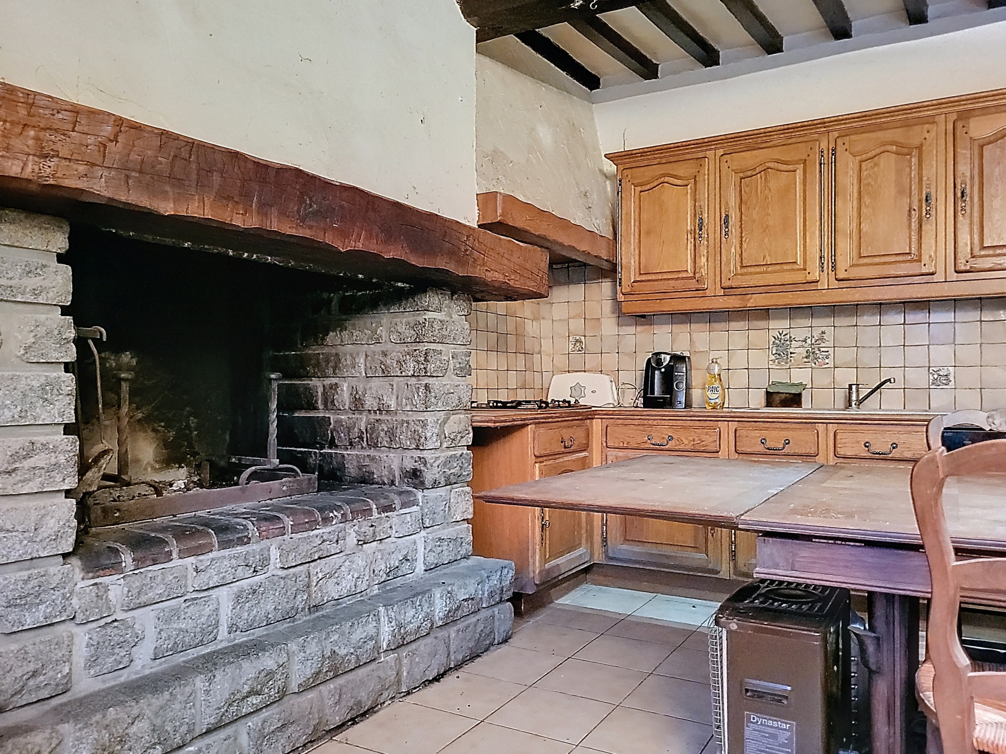 La maison comprend deux pièces de vie, dont une avec une cheminée en pierre. À l'étage, trois chambres et un grenier aménageable permettent d'envisager différentes configurations.