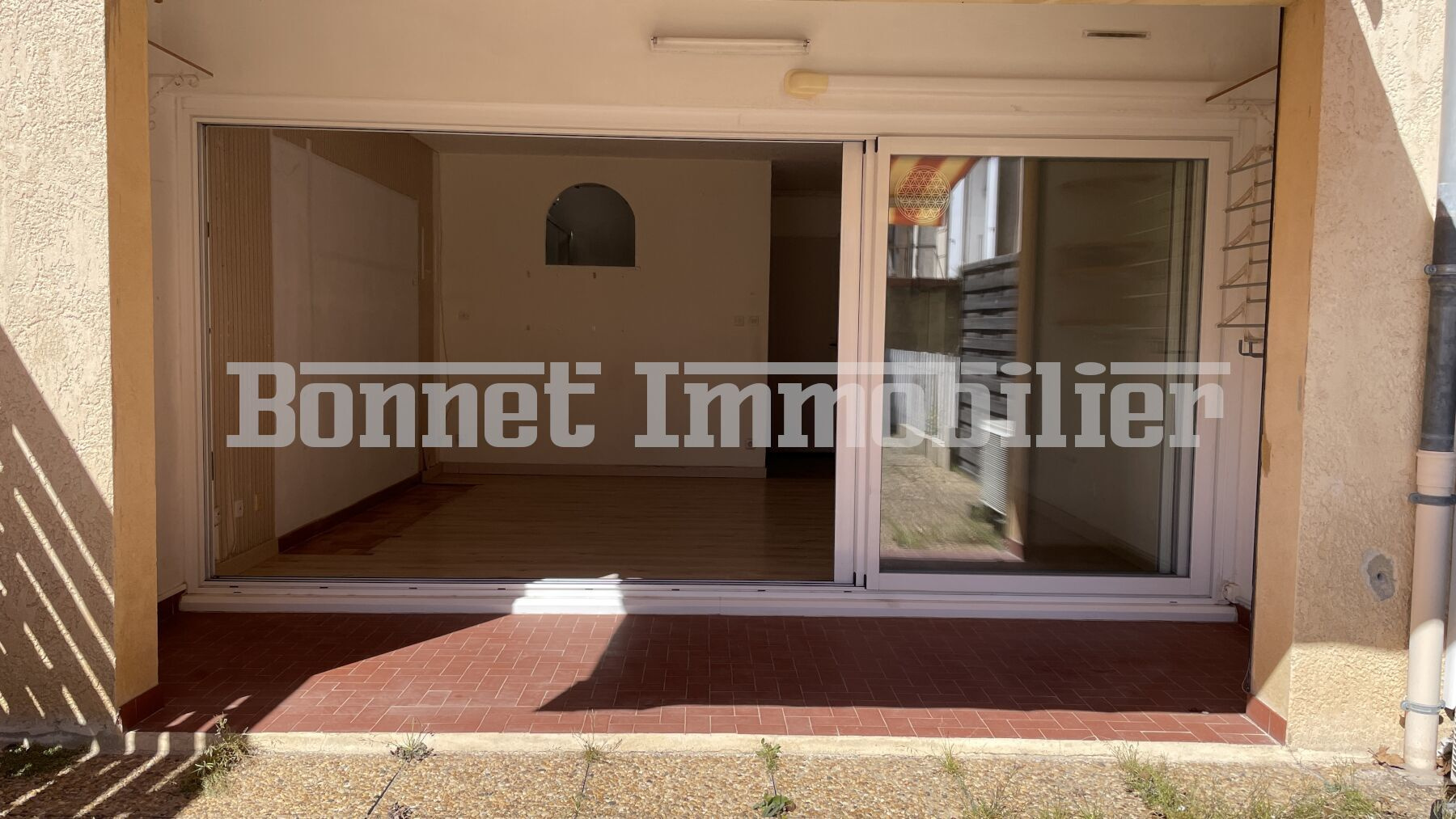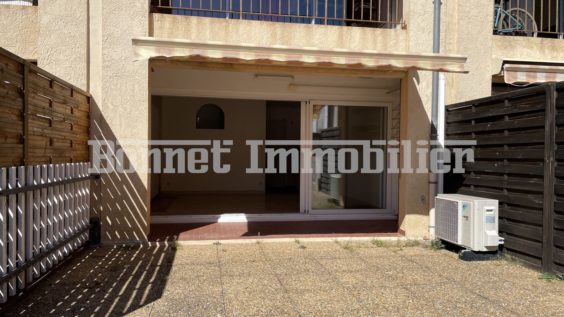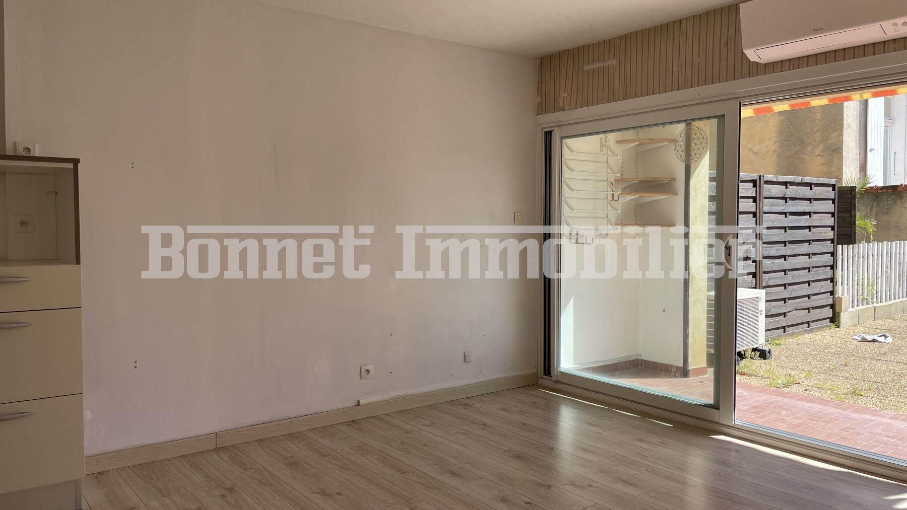 L'entrée donne accès à la kitchenette fonctionnelle et à la salle d'eau - WC récemment rénovée, tandis que la pièce à vivre d'environ 17 m2, climatisée et lumineuse, s'ouvre via une large baie vitrée sur une agréable loggia menant à la terrasse, offrant un espace extérieur généreux.