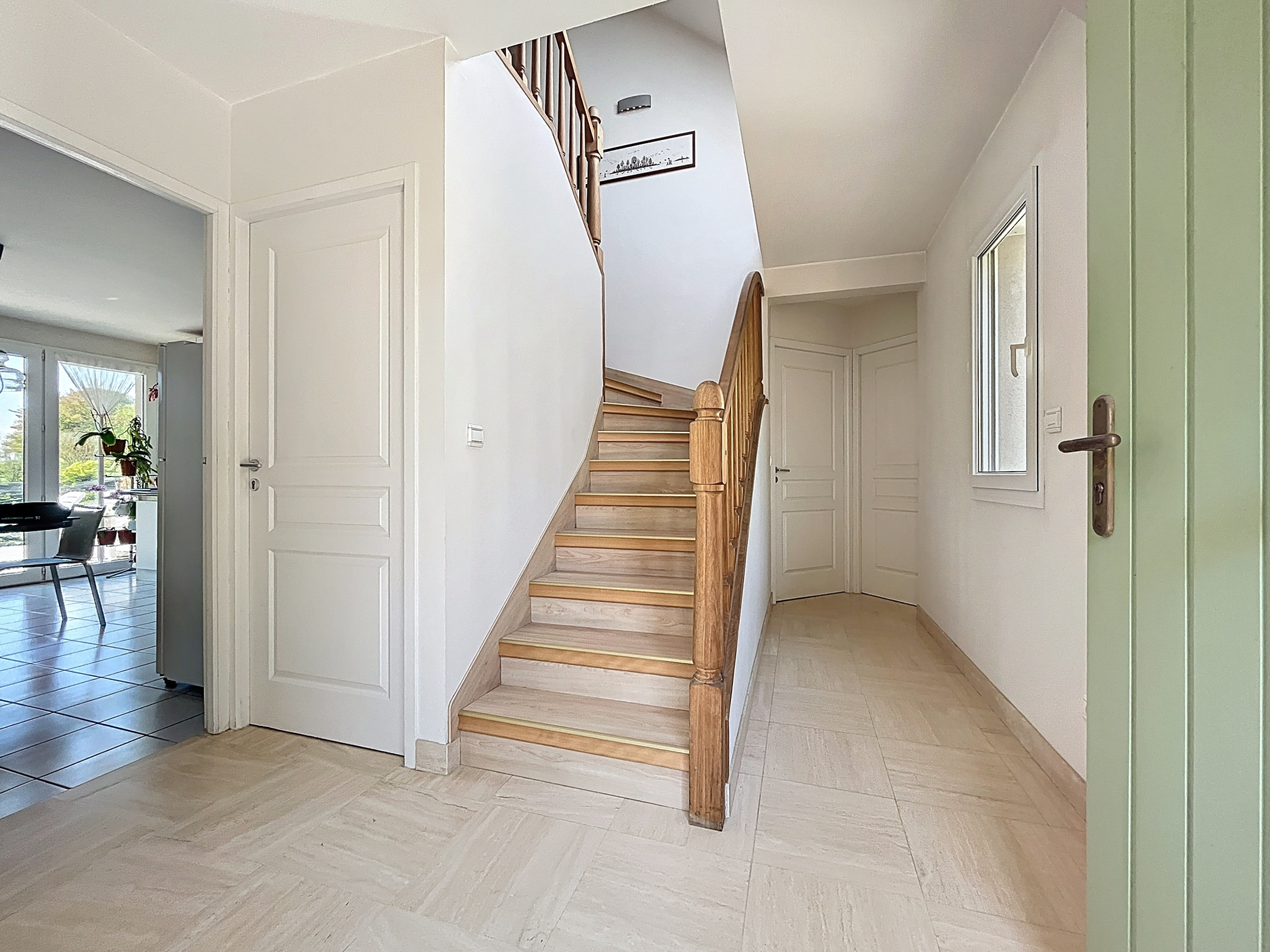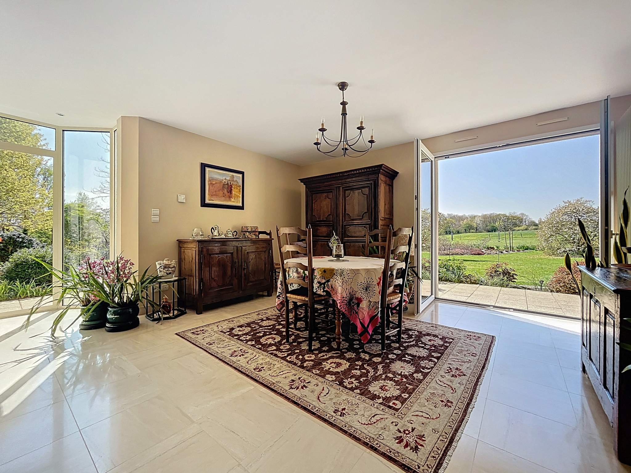 Dès l'entrée, vous découvrirez une pièce de vie lumineuse avec bow-window et poêle à bois, ouverte sur une grande terrasse invitant à la détente.