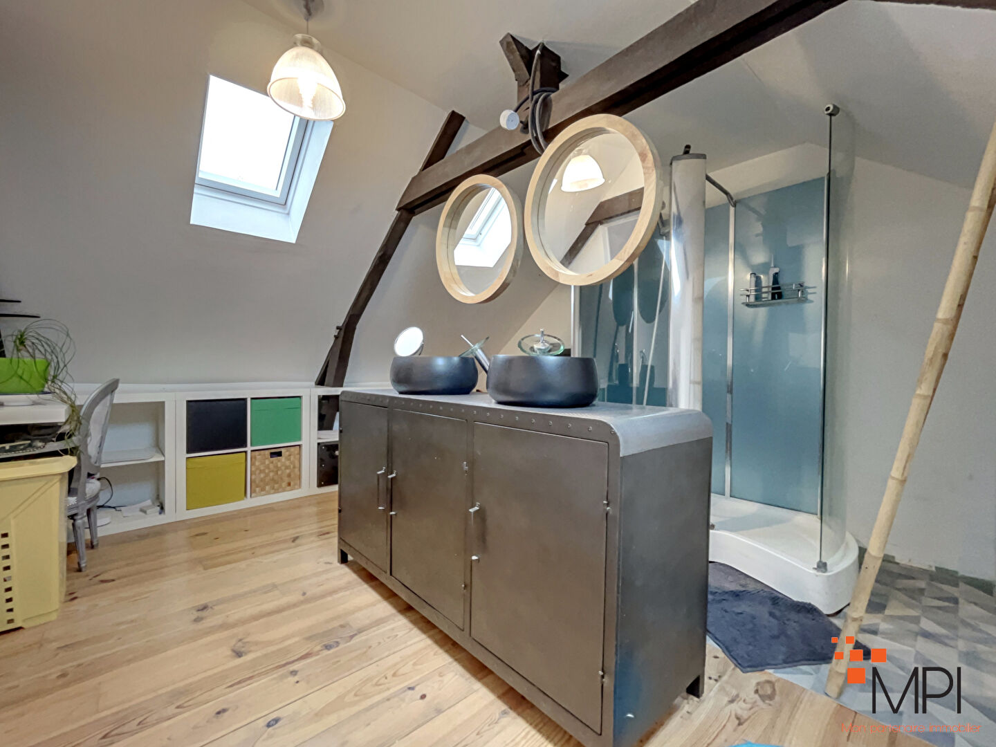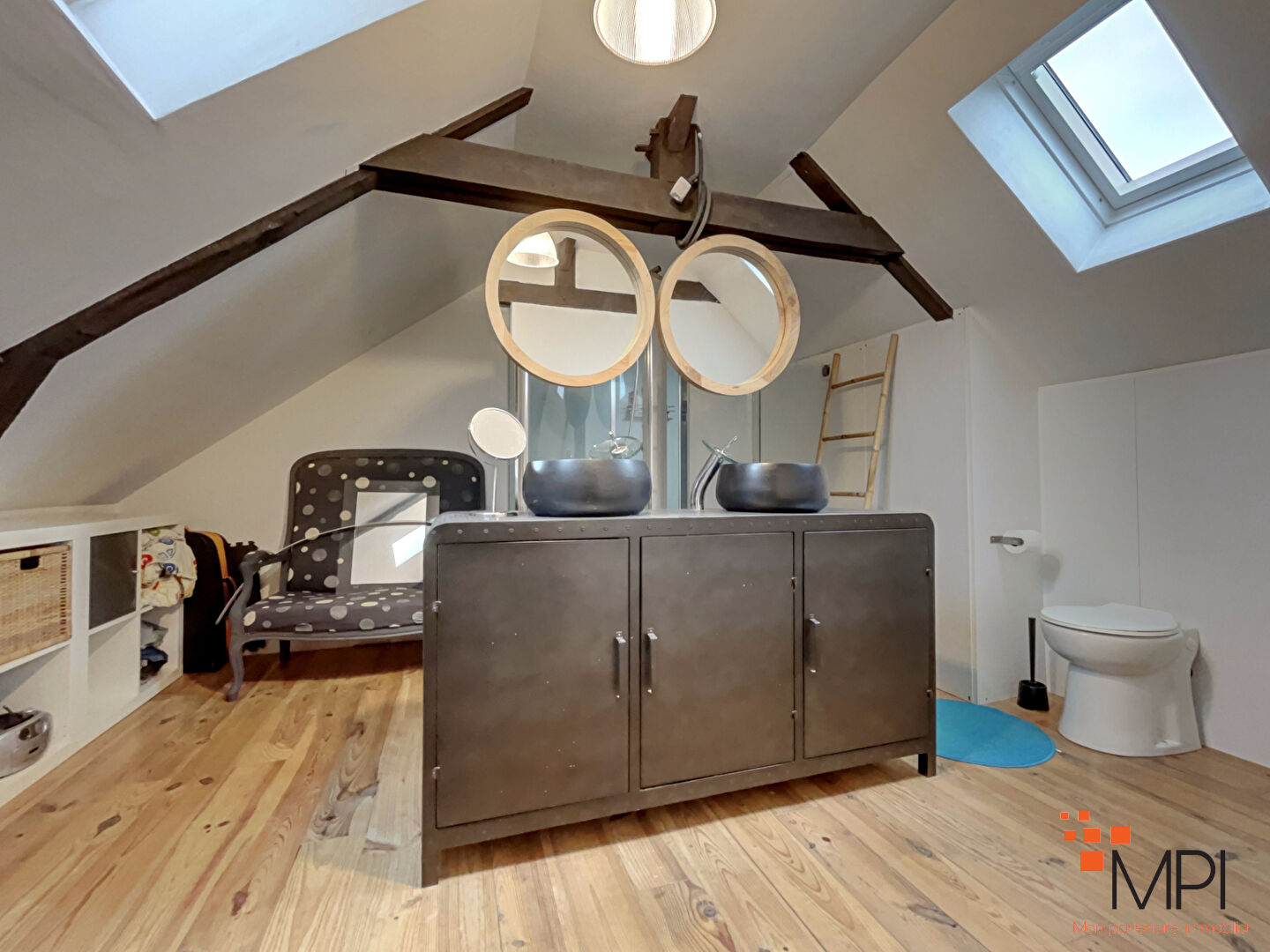 À l'étage, deux chambres spacieuses ainsi qu'une salle de bains équipée d'une douche, d'une baignoire, et de WC séparés.