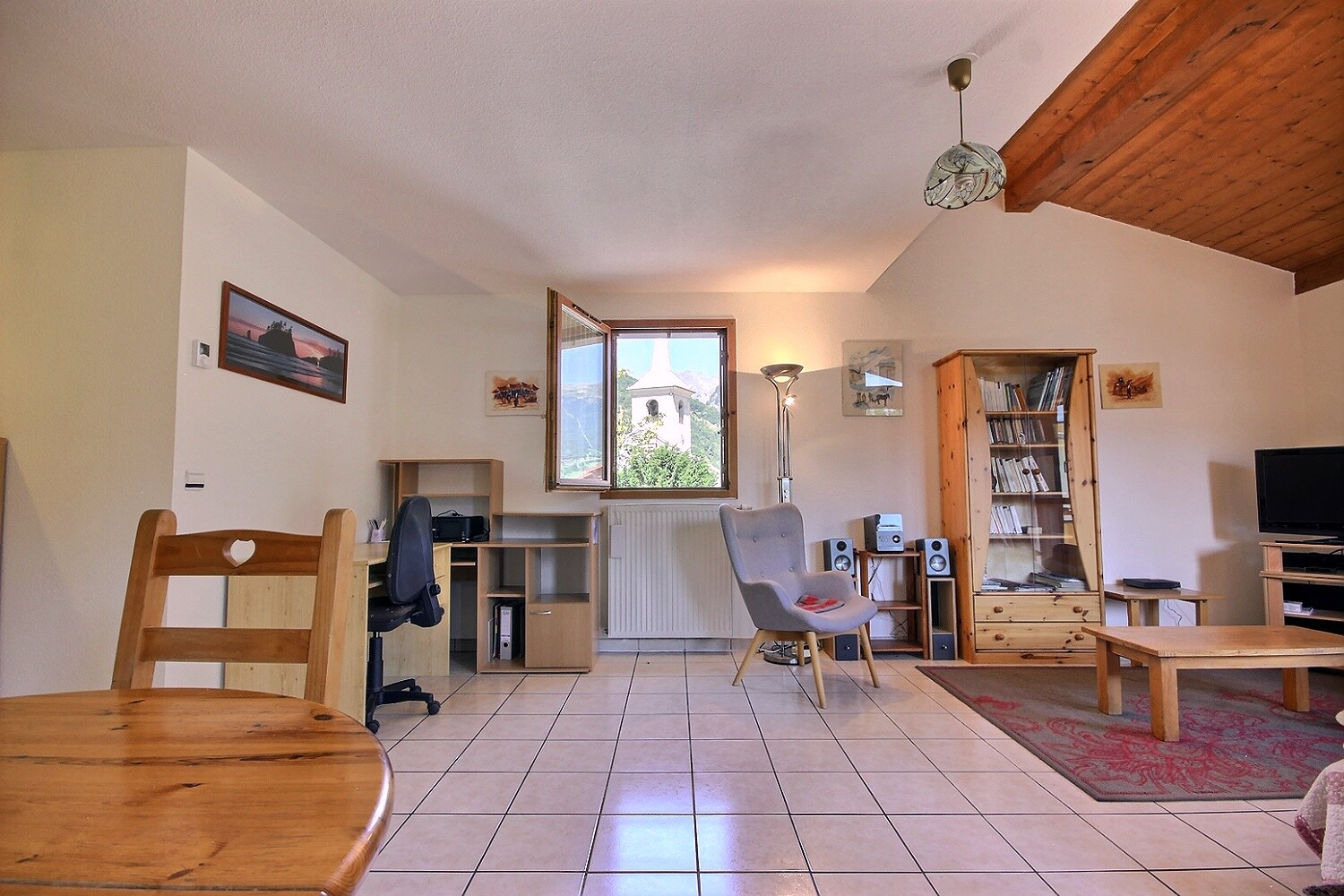 Très belle pièce lumineuse, triple exposition Vue panoramique ensoleillée sur les massifs face aux Arcs baies vitrées et une fenêtre vue surplombant le clocher.