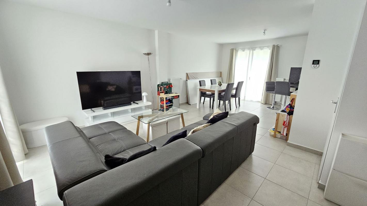 Entrée sur pièce de vie d'environ 41,8m² avec cuisine ouverte aménagée et équipée, wc, garage intégré.