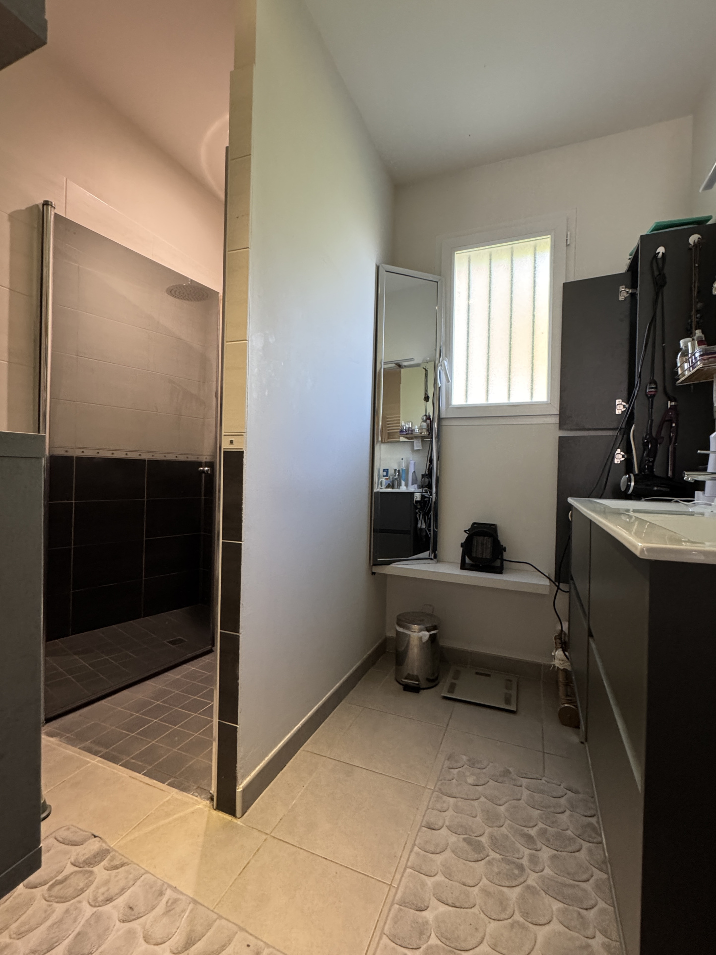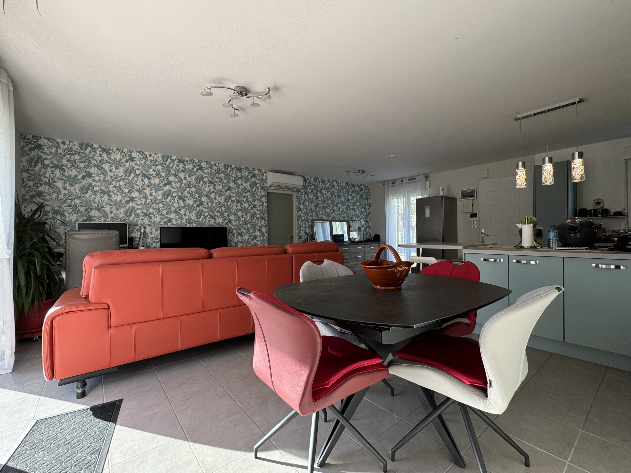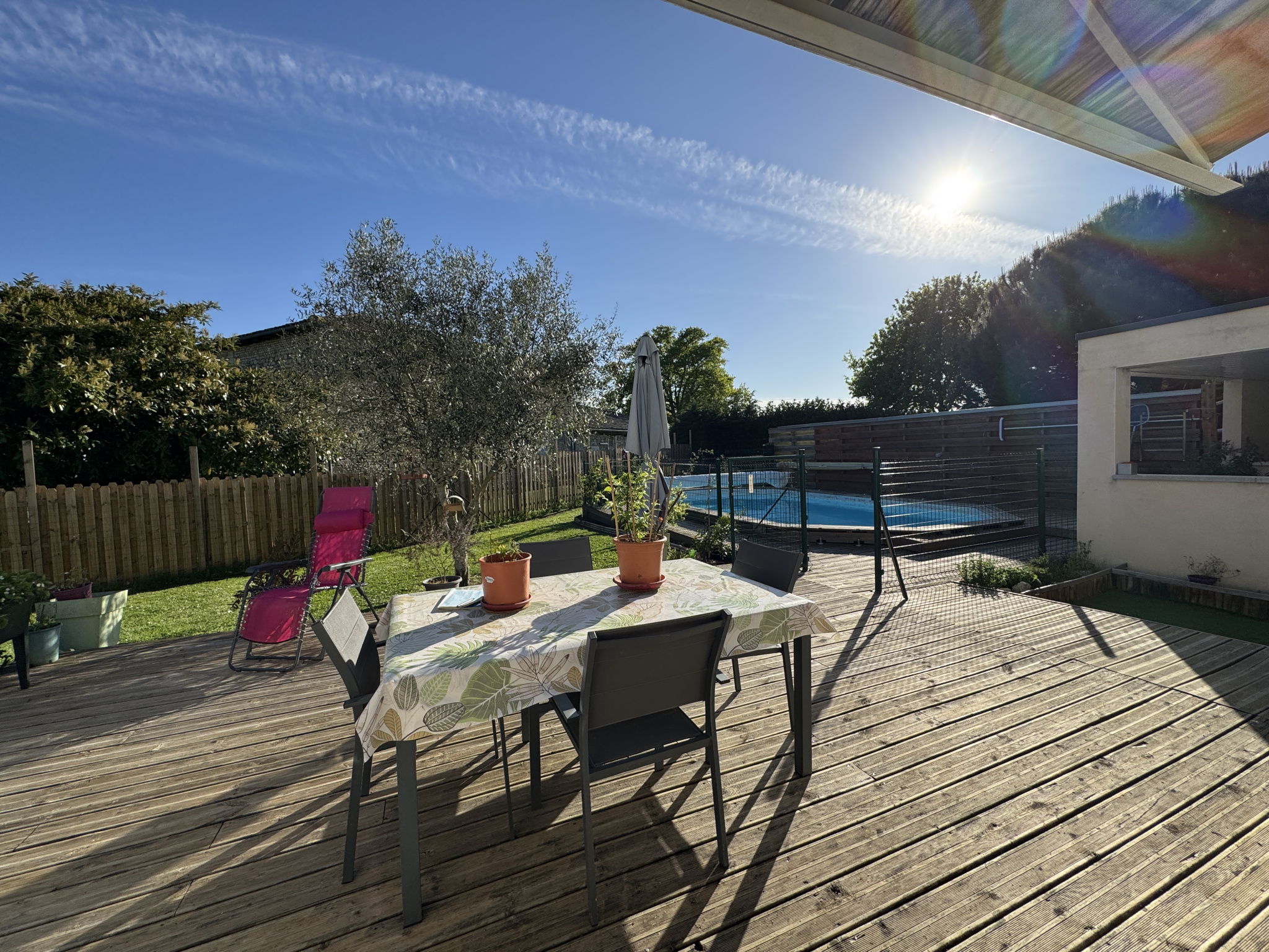 Proche de BAIGNES (16) - Idéalement située, au calme, dans un petit hameau. Maison individuelle construite en 2013 sur un terrain clos de 1945 m2. Elle offre environ 88 m2 habitables de plain pied. L'agréable séjour avec cuisien équipée neuve s'ouvre par une baie sur une jolie terrasse en bois qui donne accés à la piscine et à la cuisine d'été. Trois chambres avec placards. Salle d'eau avec douche à l'italienne. Pièce de buanderie débarras de 20 m2 exploitable facilement. Atelier. Carport pour deux voitures. Services et écoles à 3 min. Accés facile N10 vers Bordeaux et Angoulême. Ensemble en parfait état !