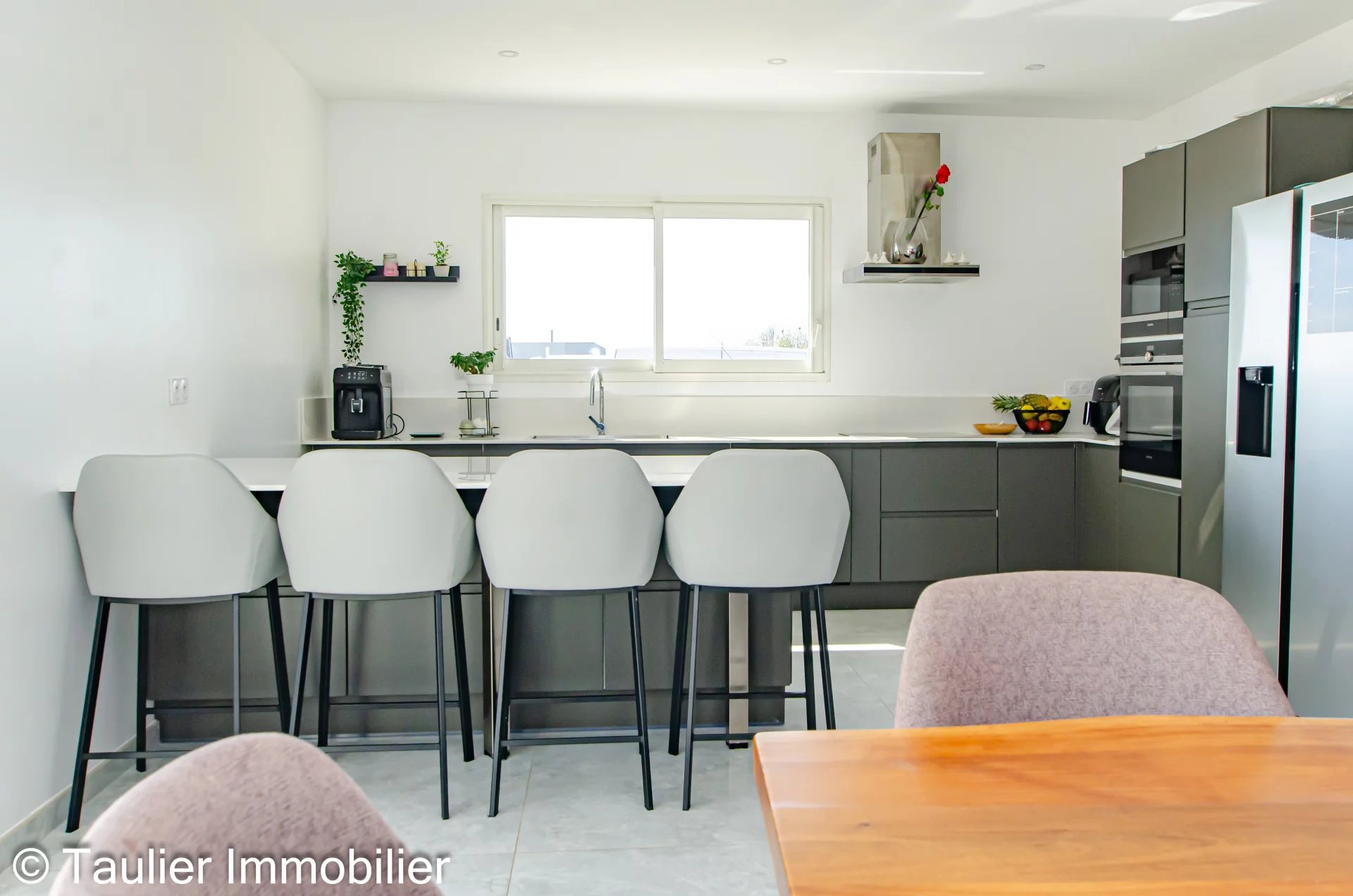 La cuisine allie design contemporain et fonctionnalité, son ilot central (parfait pour le quotidien) est complété par le bel espace de salle à manger (28m²) pour recevoir famille ou amis.