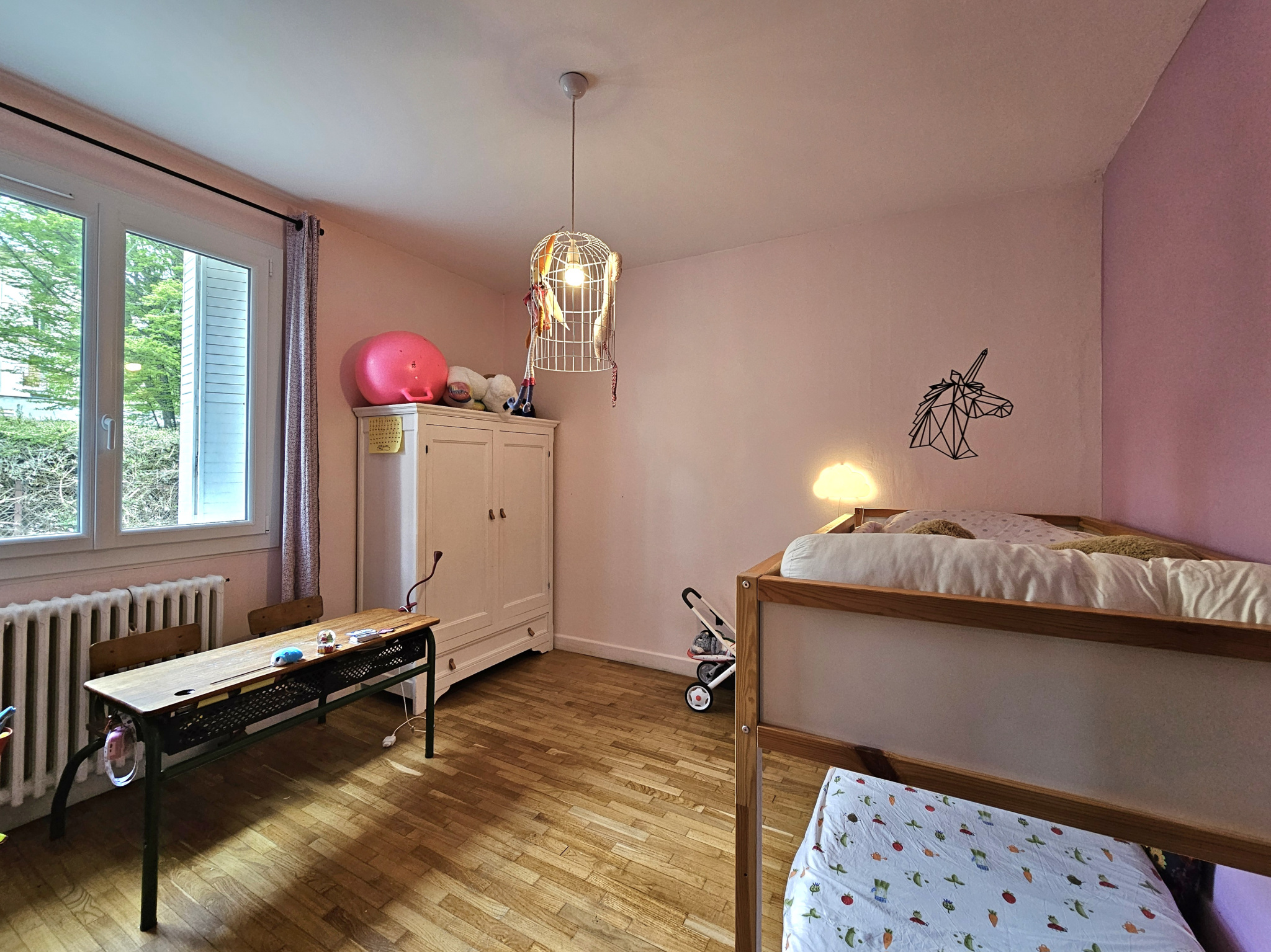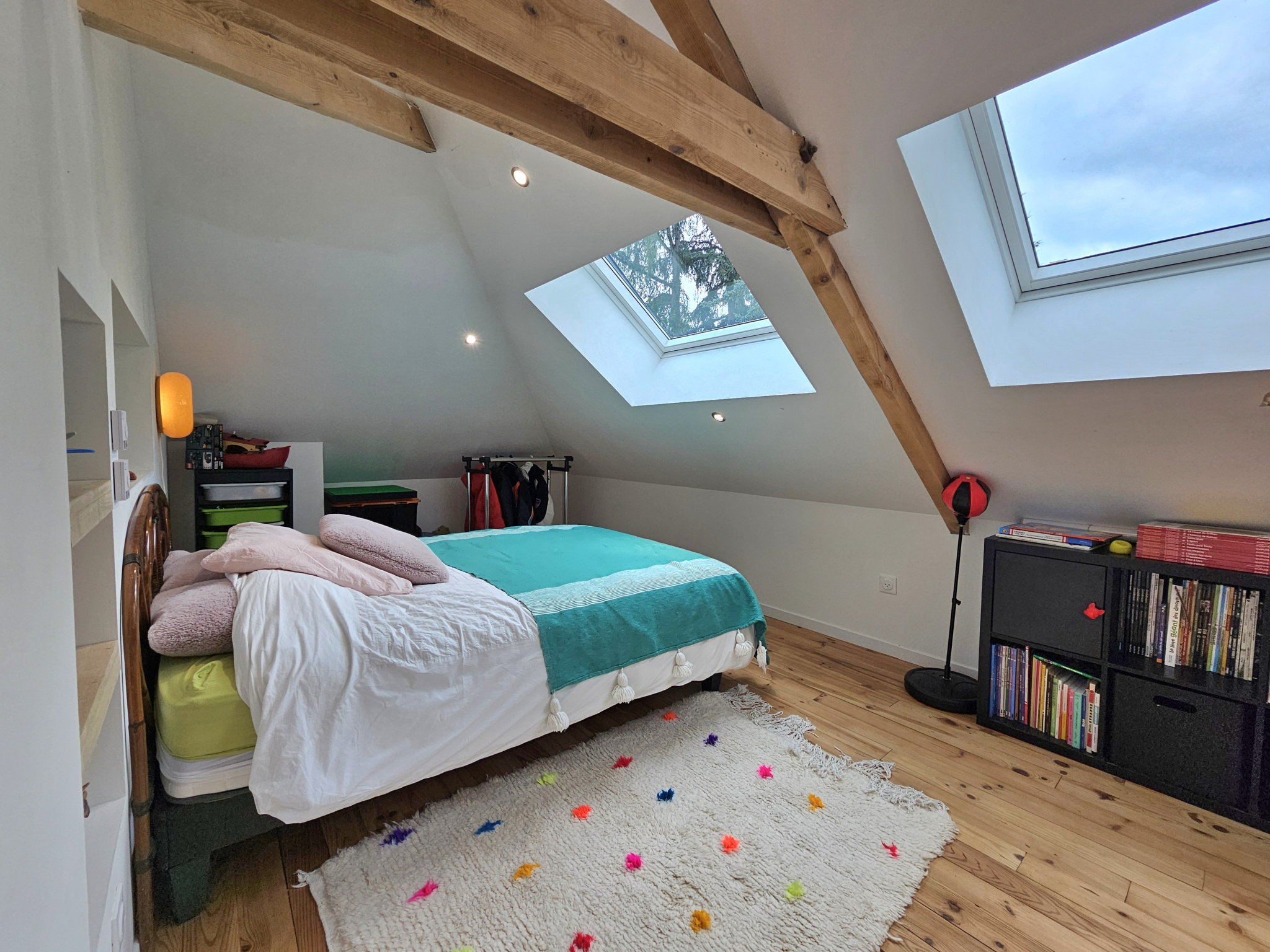Le deuxième étage mansardé et lumineux, offre deux grandes chambres de 19 et 20m2 avec Velux et volets solaires, un palier de 14m2 et une salle de bains.