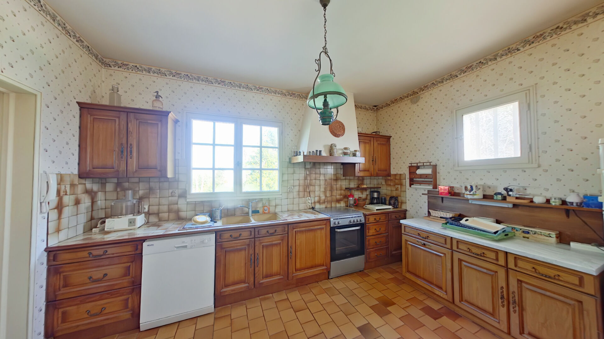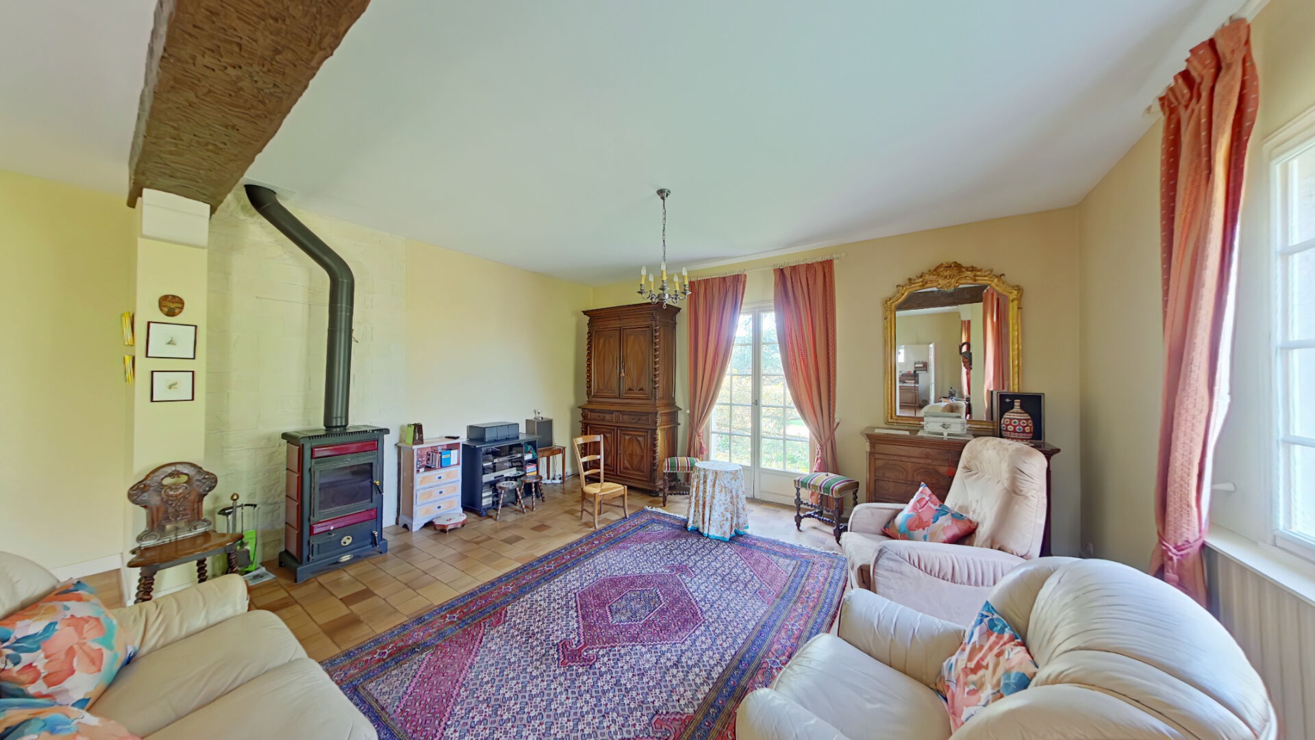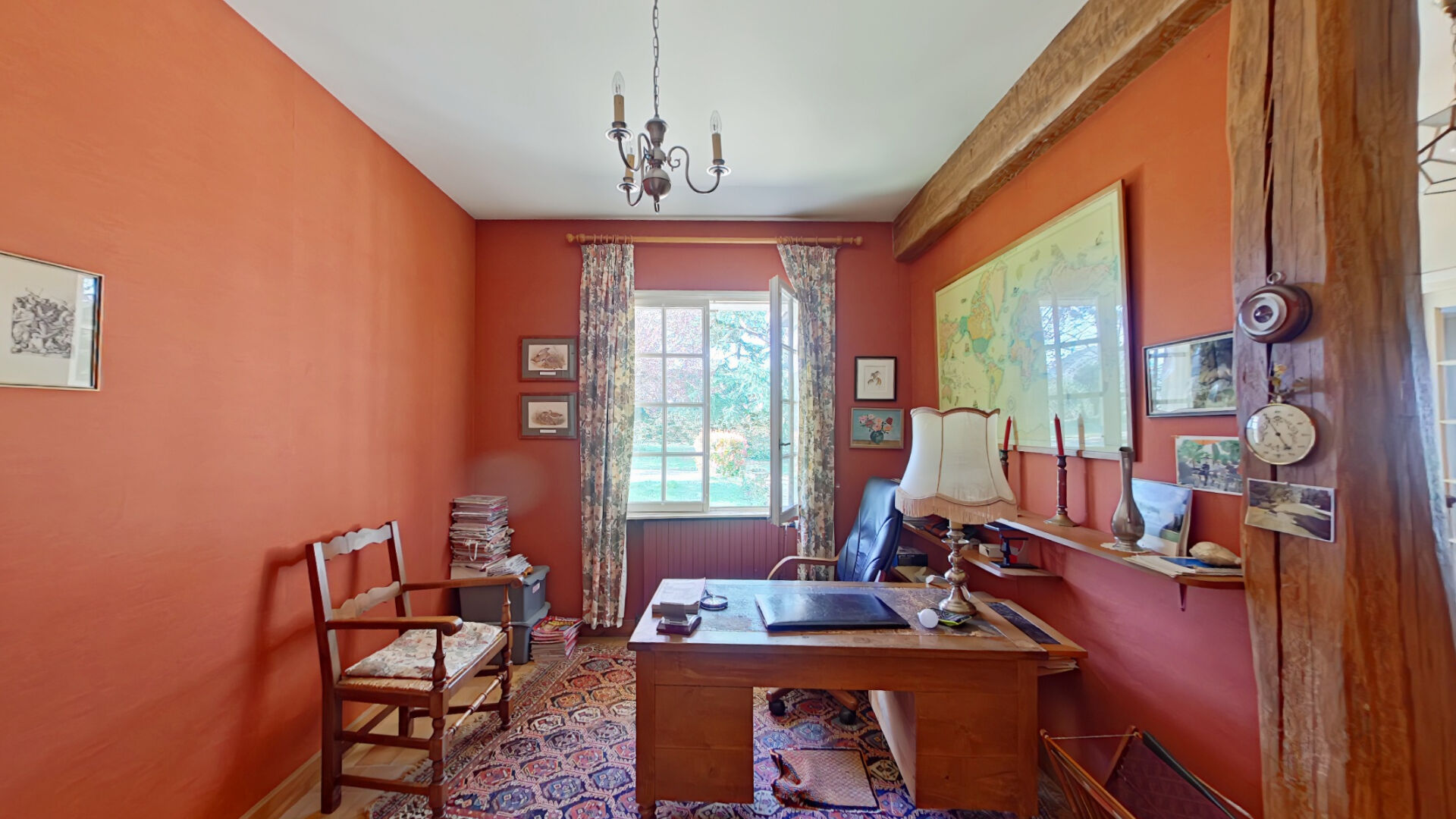 Hall d'entrée, grande pièce de vie lumineuse de plus de 50m² avec poêle à bois, cuisine aménagée indépendante, un bureau, une suite parentale avec salle d'eau.