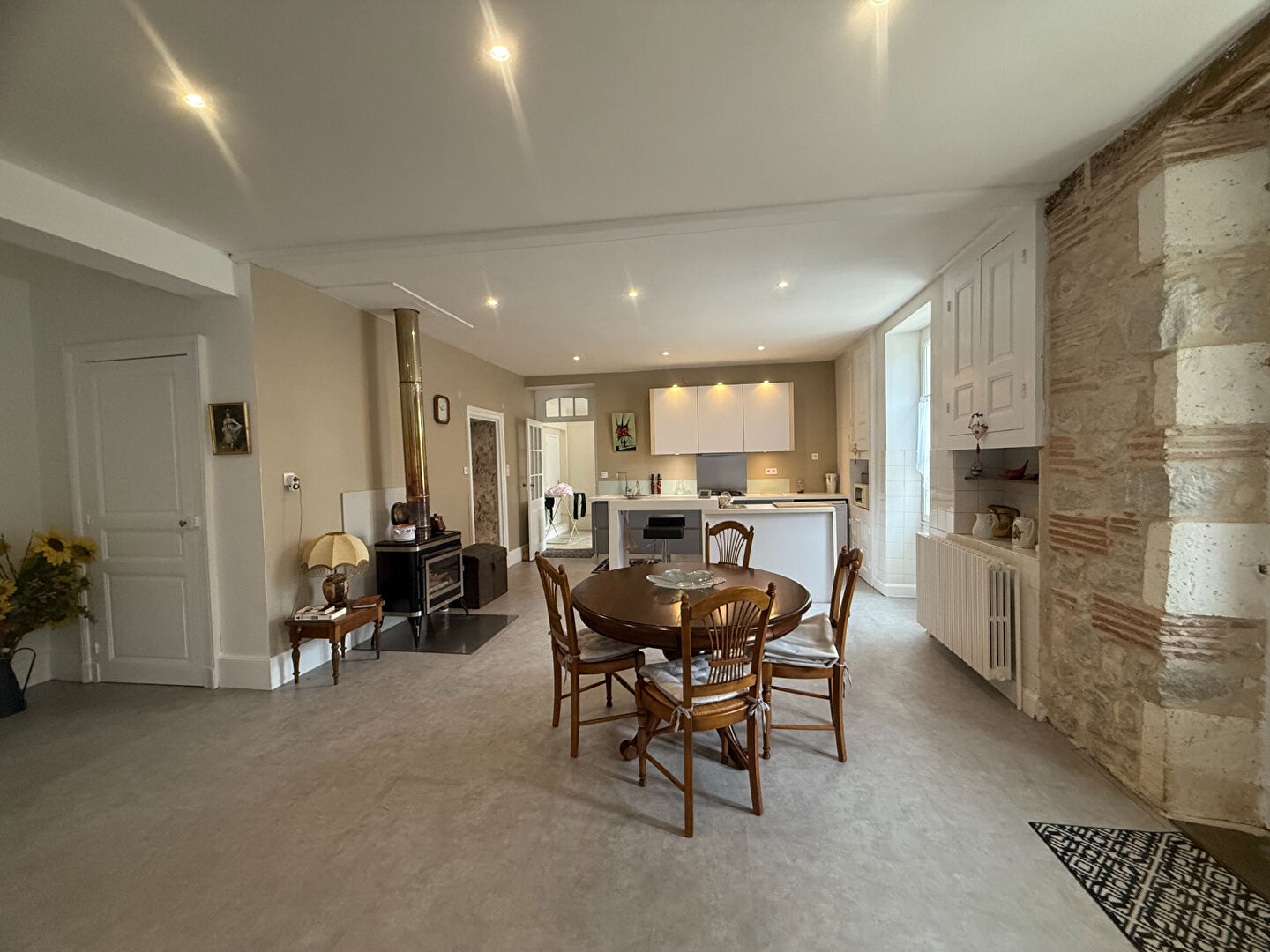 La maison principale d'environ 132 m² est composée d'une cuisine ouverte sur le salon/salle à manger avec son poêle à bois, de 3 chambres, d'une salle d'eau avec wc et d'une arrière-cuisine/buanderie.