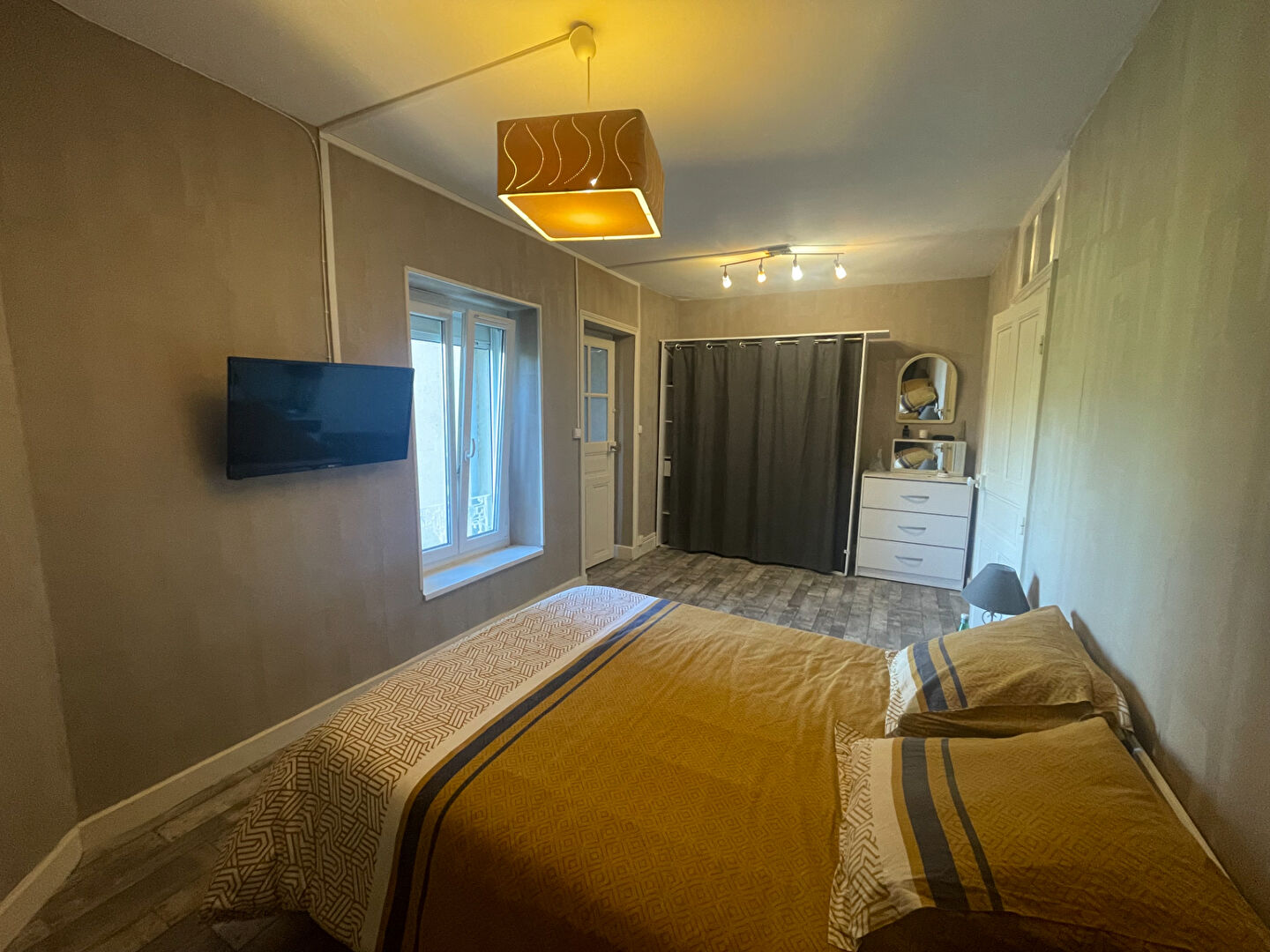 Une entrée avec WC , une vaste pièce de vie donnant sur une cuisine aménagée et équipée, une chambre, une salle d'eau.