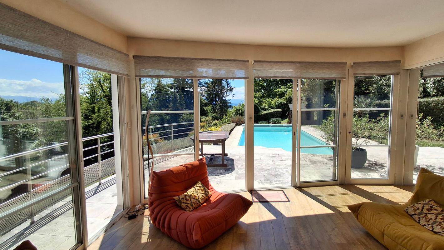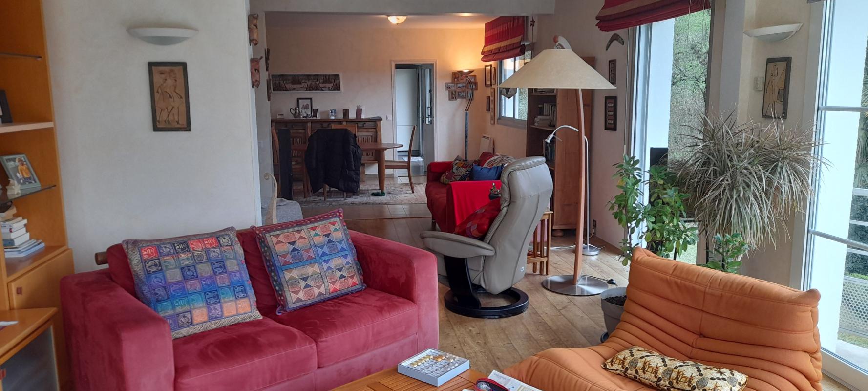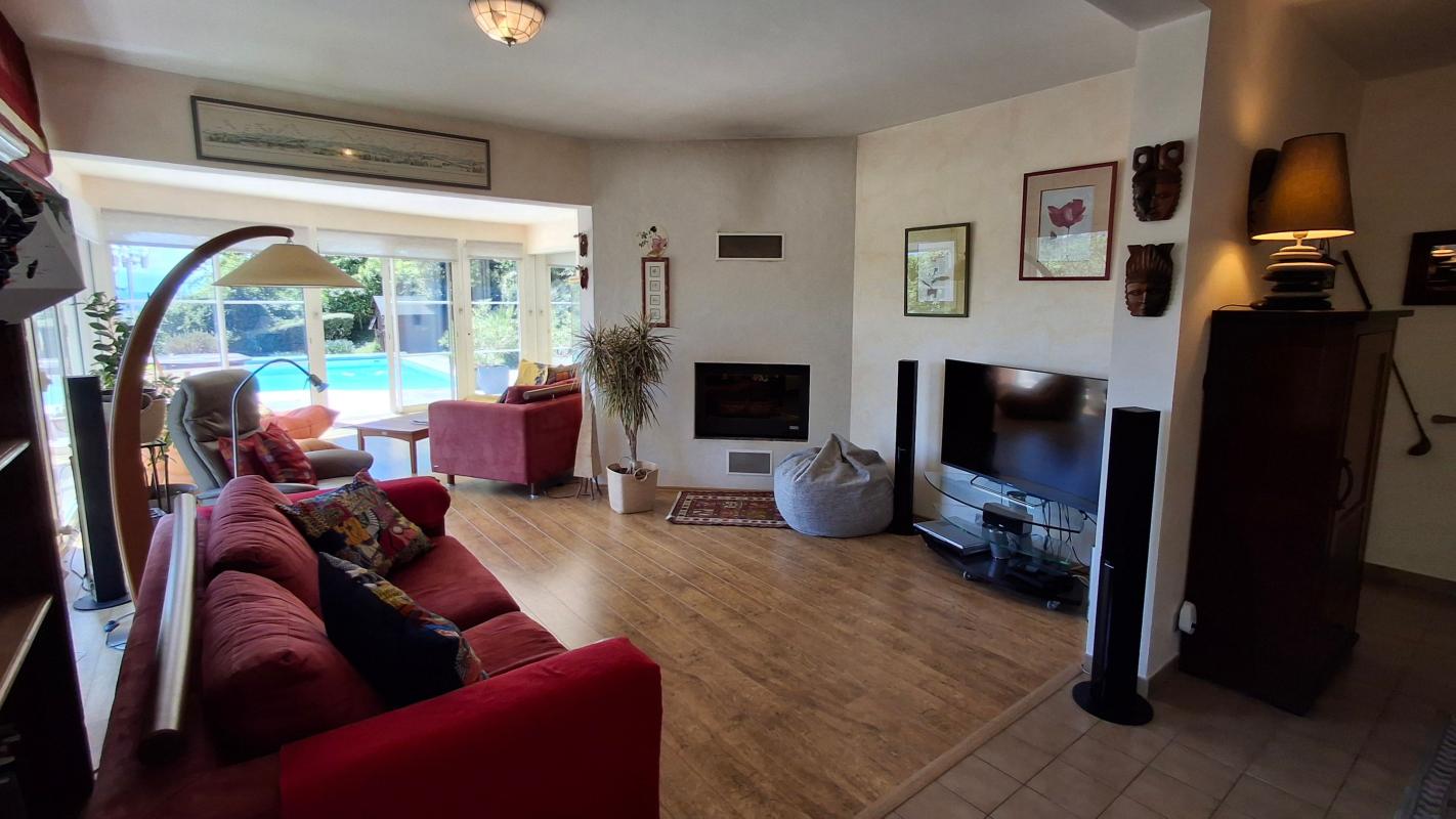 Le salon baigné de lumière offre un espace de vie convivial, prolongé par une terrasse agrémenté d'une magnifique piscine au sel.