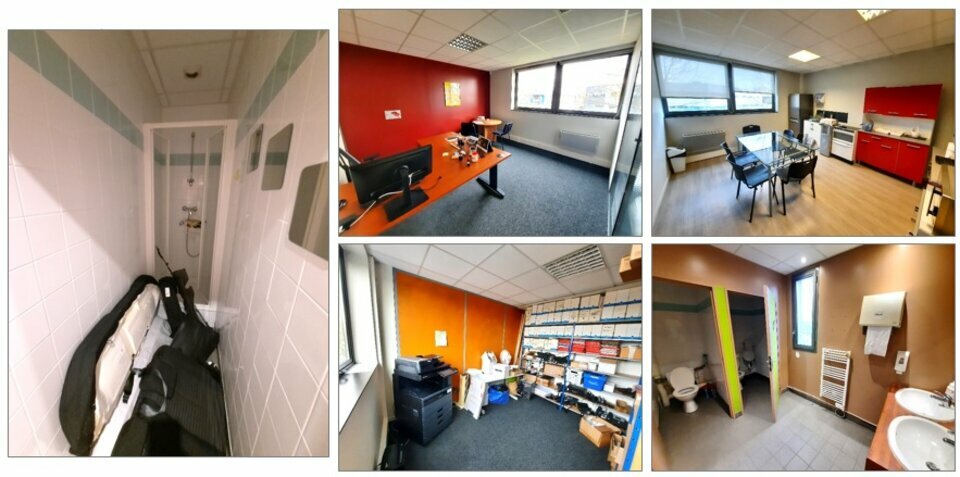 Cette surface est composée d'un hall d'accueil, d'une salle de réunion, de 4 bureaux dont un très grand, de 21 postes de travail en open-space, d'un local technique et de sanitaires avec douche + espace cuisine.