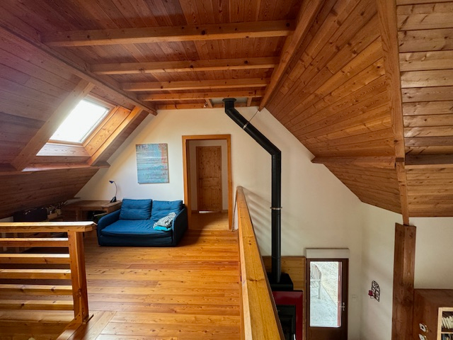 A l'étage : une mezzanine ouverte sur séjour distribue quatre chambres, salle de bains/ douche, wc et un rangement (possibilité d'une douche supplémentaire)