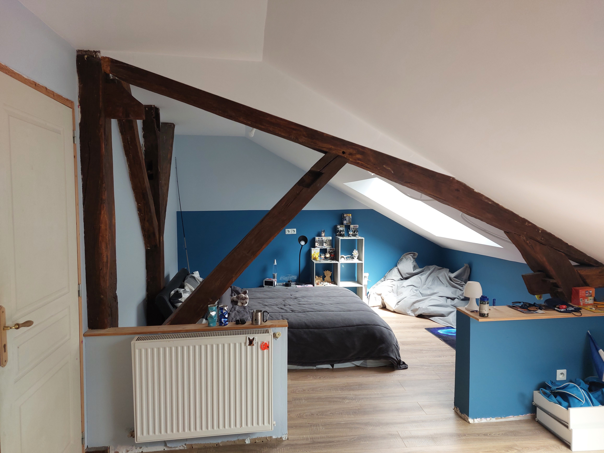 À l'étage : deux chambres, un grand salon, un accès à encore 100m2 de combles à aménager.