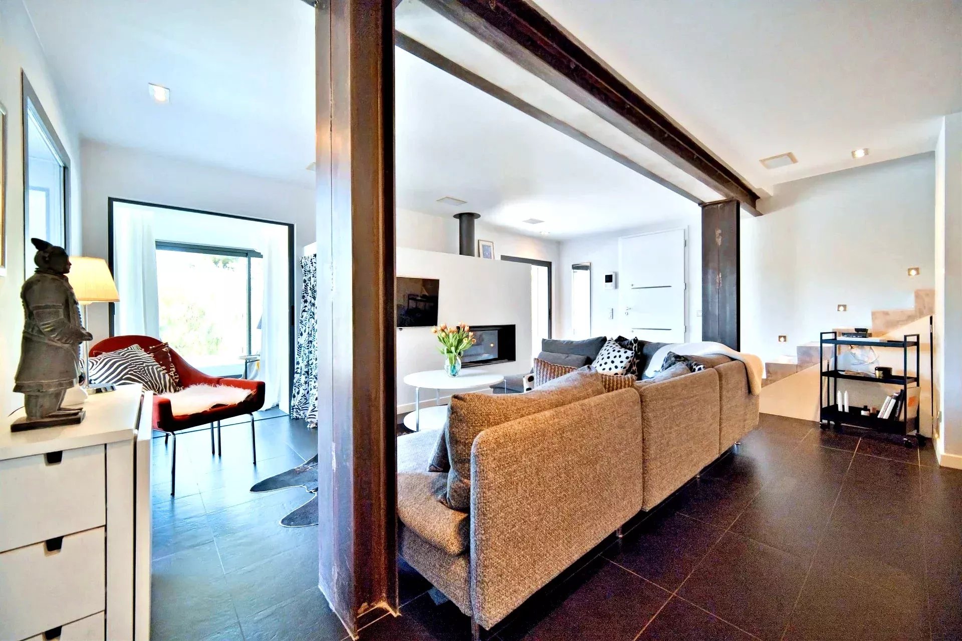 La villa offre un séjour avec cheminée au gaz, une pièce de vie lumineuse en prolongement, un espace salle à manger avec cuisine ouverte entièrement équipée, 2 chambres indépendantes en suite avec chacune sa salle de bains, dont une suite parentale avec terrasse privative et 3ème chambre attenante. 2 WC indépendants. Une buanderie.